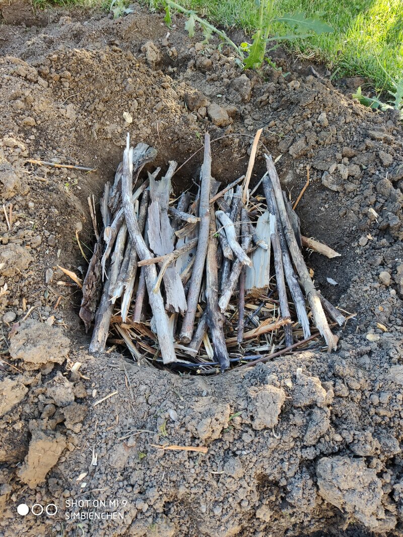 Die Erde hatte ich beim Ausgraben schon als Erdwall um das Kellerloch geschichtet. Dann kamen gehortelte größere Totholzstücke dazu, mal liegend , mal stehend ....