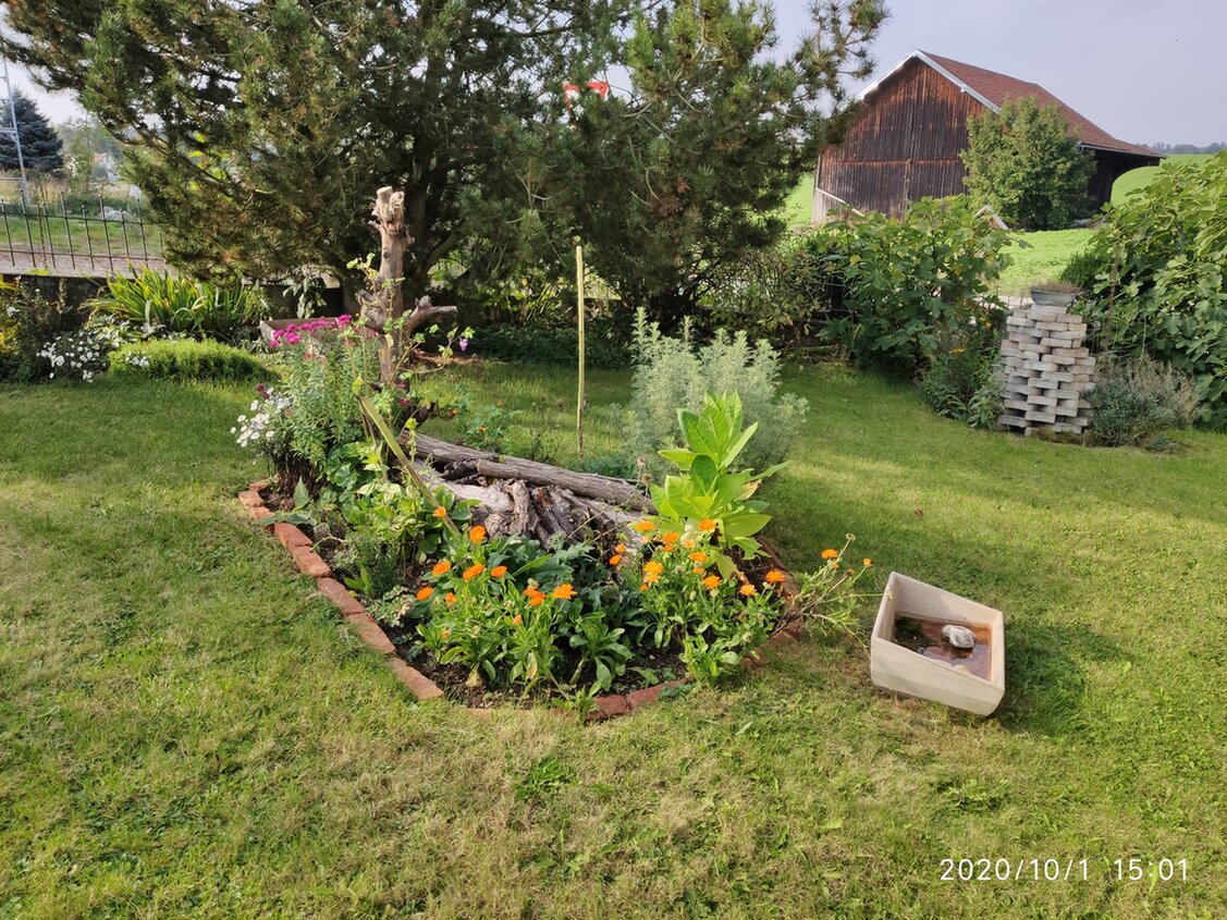 Das Käferkeller -Beet im Oktober 2020 plus Vogeltränke