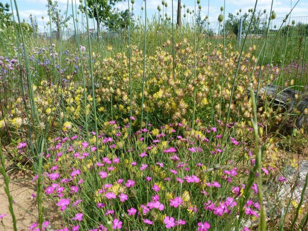Nahaufnahme in das Blütenmeer: Im Vordergrund blüht die Heidenelke, dahinter in gelb der Gewöhnliche Wundklee. Der Kugelköpfige Lauch streckt seine Blütenstängel in die Höhe und beginnt bald zu blühen.