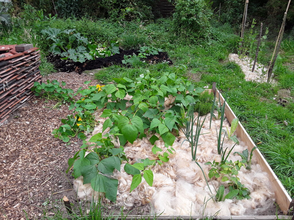 Ich habe im Frühjahr eines meiner Hügelbeete mit Schafwolle gemulcht (mehr Wolle hatte ich nicht). Ich fand es gut. Den Geruch mag ich ganz gerne. Der Hund vom Nachbarn auch - Herrcheb konnte sich nicht erklären, warum der Hund plötzlich ständig zu mir rein wollte …
