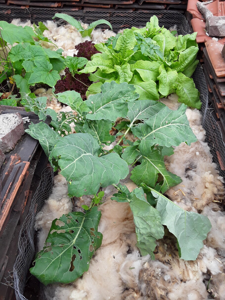 Zersetzt hat sich die Wolle nur langsam, es sind immer noch Flocken da. Das stört mich aber nicht, sie vertun sich mit in der Mulchschicht.