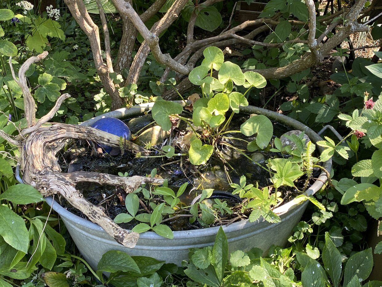 Es gibt eine Pyramide, eine Wanne als Teich und eine Wanne als Sumpfbeet. Eigentlich hätte ich noch gerne einen kleinen Teich, habe aber etwas Platzprobleme.