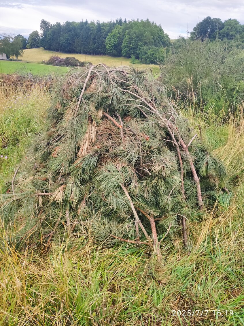 Da uns ein Gewitter unsere halbe Kiefer umgeworfen hat, ist aus dem Astschnitt in der Wiese ein neuer Haufen entstanden.