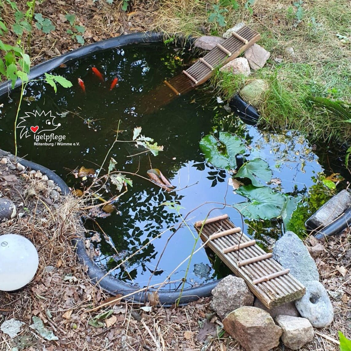 Wer einen Teich im Garten hat, kann ihn als Tränke für die Igel herrichten. Er sollte aber immer durch eine Ausstiegshilfe abgesichert sein! Igel sind in der Regel wasserscheu, sie können aber schwimmen. Aber sie sind keine Rettungsschwimmer und darum sollten sie schnell wieder ans rettende Ufer gelangen. Tiefere Teichstellen sollten mit Kletterhilfen ausgestattet sein, die mit " Tritten" versehen sind. Nur ein Brett oder ein Ast reicht allein nicht als Ausstieg. Sie vermoosen mit der Zeit und werden zu rutschig.