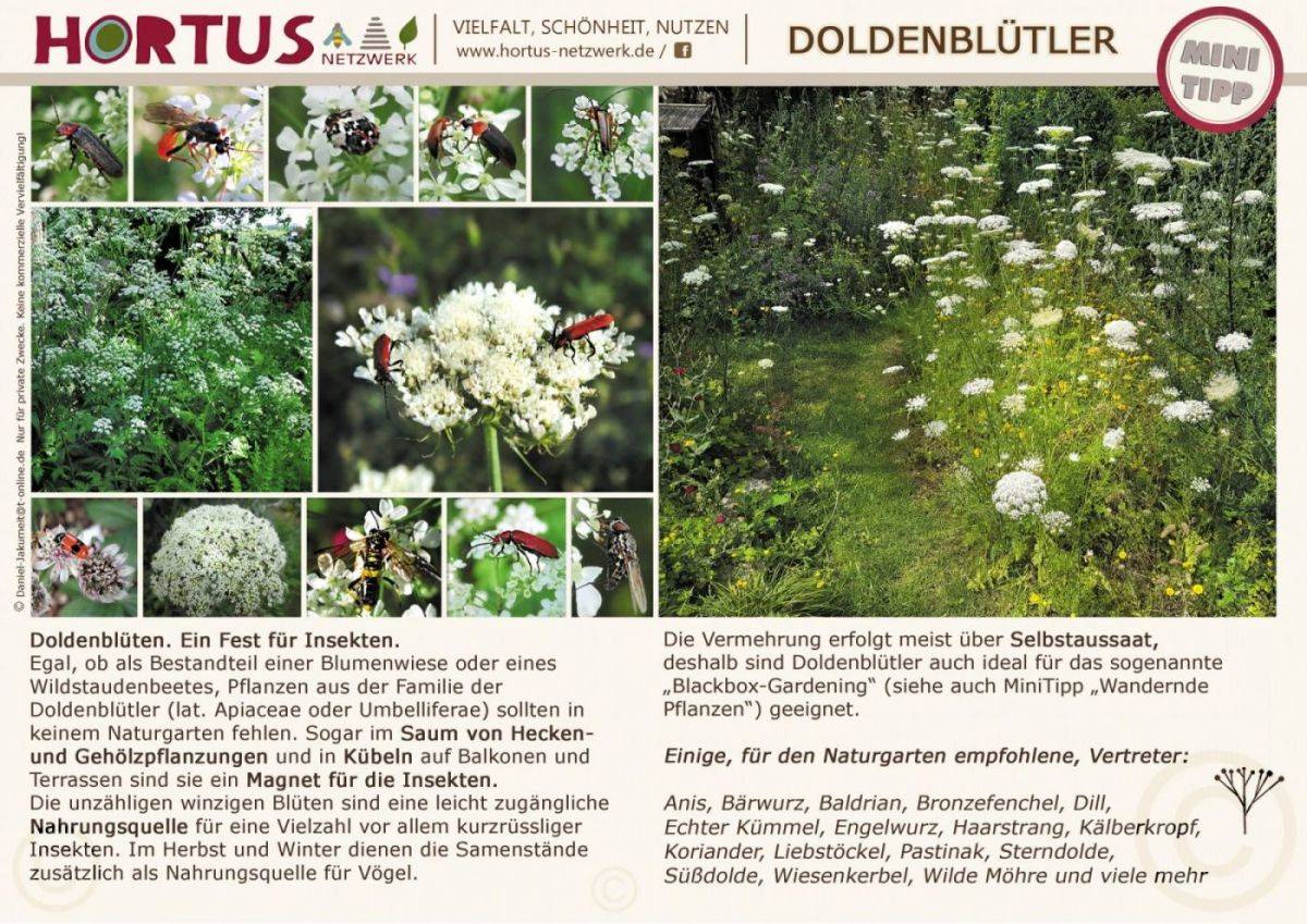 Egal, ob als Bestandteil einer Blumenwiese oder eines Wildstaudenbeetes, Pflanzen aus der Familie der Doldenblütler (lat. Apiaceae oder Umbelliferae) sollten in keinem Naturgarten fehlen. Sogar im Saum von Hecken oder Gehölzpflanzungen und in Kübeln auf Balkon oder Terassen sind sie ein Magnet für die Insekten.