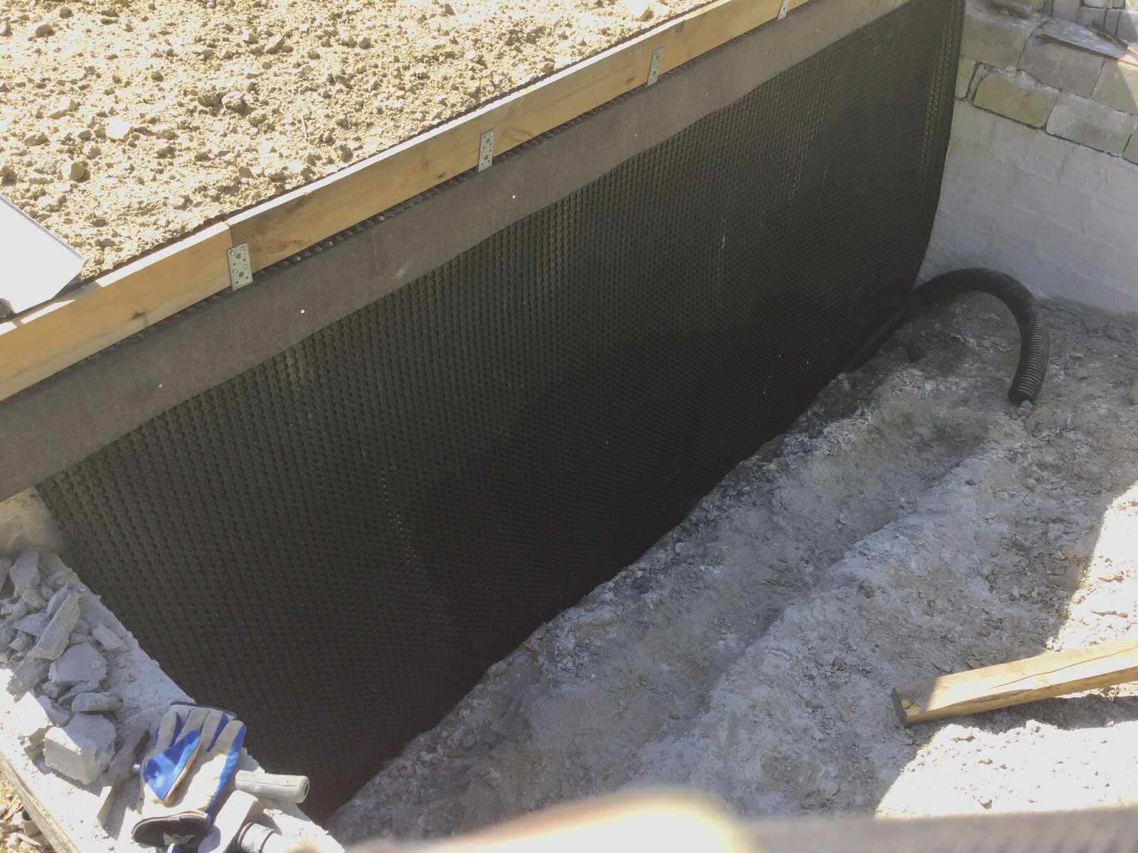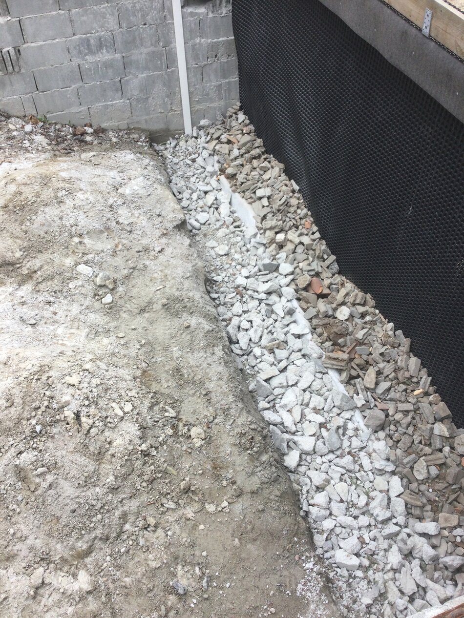 Heute kam Noppenfolie an die Wand, das Drainagerohr in die Rinne, mit Vlies omwickelt und die Rinne aufgefüllt mit kleingeschlagenem Bauschutt.
