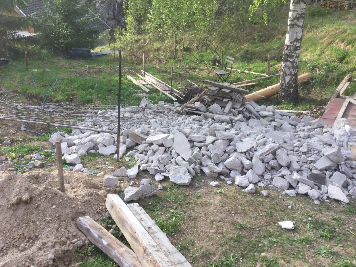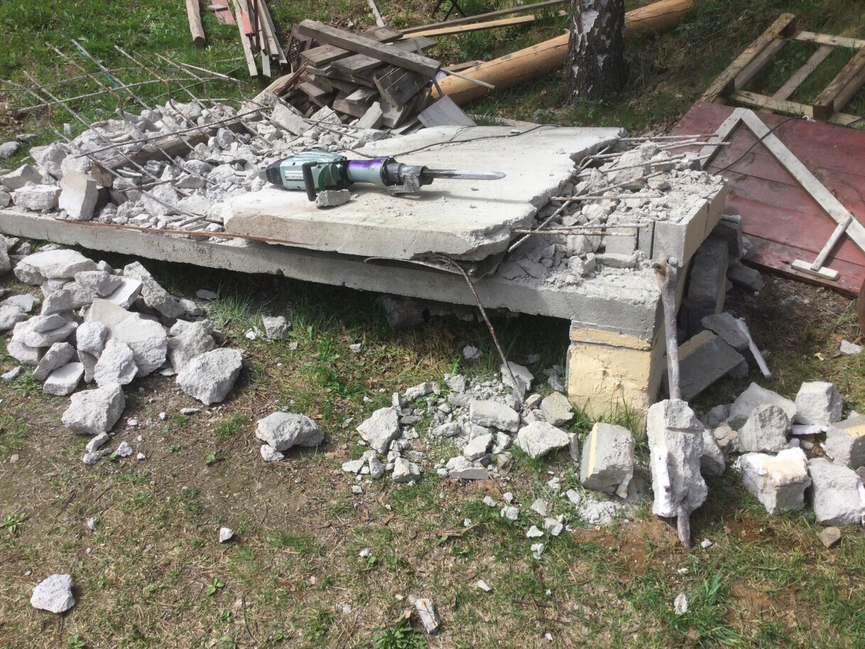 Der nächste Schritt ist das Zerdeppern von den zwei Betongplatten die übrig waren. Da sind Armierungsstäle drin, die ich wiederverwenden möchte.