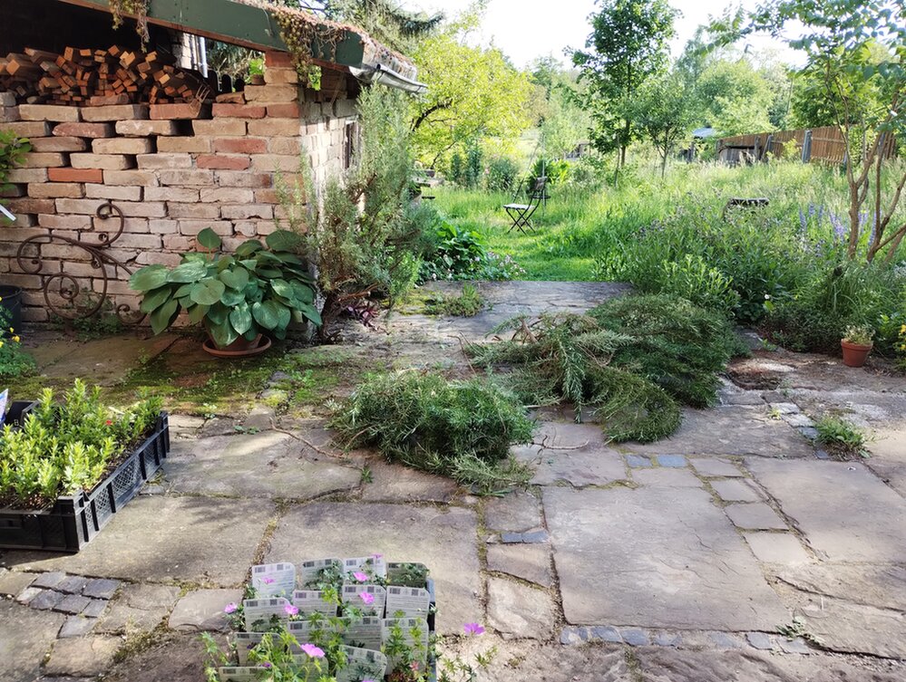Auf dem Foto der verbleibende Rosmarin und die 'Berge' von Schnittgut. Er war wirklich riesig vorher.