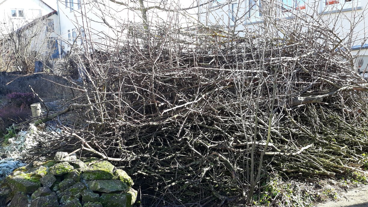 Unser großer Reisighaufen "Spatzenhausen" liegt für mich günstig erreichbar am gepflasterten Wäschetrockenplatz und zählt zur Pufferzone. Damit ist er ebenso wie die Stumpery und der Topfgarten im Hof immer ein lohnendes Winterprojekt, bei welchem man "fast gar nicht" bei der Winterruhe stört... hoffentlich! Die Spatzen flattern auf die umliegenden Dächer sobald ich ein neues Reisigbündel bringe und wenn ich mich auch nur kurz entferne, überprüfen sie sofort begeistert die Erweiterungen ihres Domizils. Da die Nachbarin seit vielen Jahren ganzjährig füttert, sind die Piepmätze Menschen gegenüber relativ mutig und gelassen. Im Moment fällt viel Baumschnitt aus der Nachbarschaft an und "Spatzenhausen" ist jetzt höher als ich.