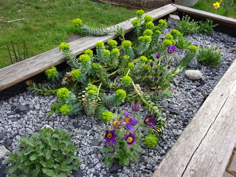 Das Hochbeet mit Schotter nimmt Farbe an, wobei hier einiges eingegangen ist. Dafür wird die Walzenwolfsmilch gefühlt von Tag zu Tag größer. Im vorderen Bildrand eine rosa Katzenminze, letztes Jahr gezogen aus dem Samentauschpaket.