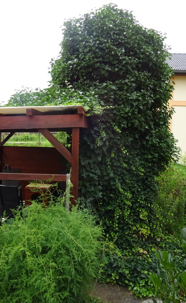 Ich nehme den Efeu: er bietet Nahrung und Versteckmöglichkeiten für diverse große und kleine Tiere und uns Schatten und Kühle, wenn es heiß ist. Sein Gerüst ist ein vor wenigen Jahren gefällter Nussbaum, von dem ein Stammstück stehenbleiben durfte.