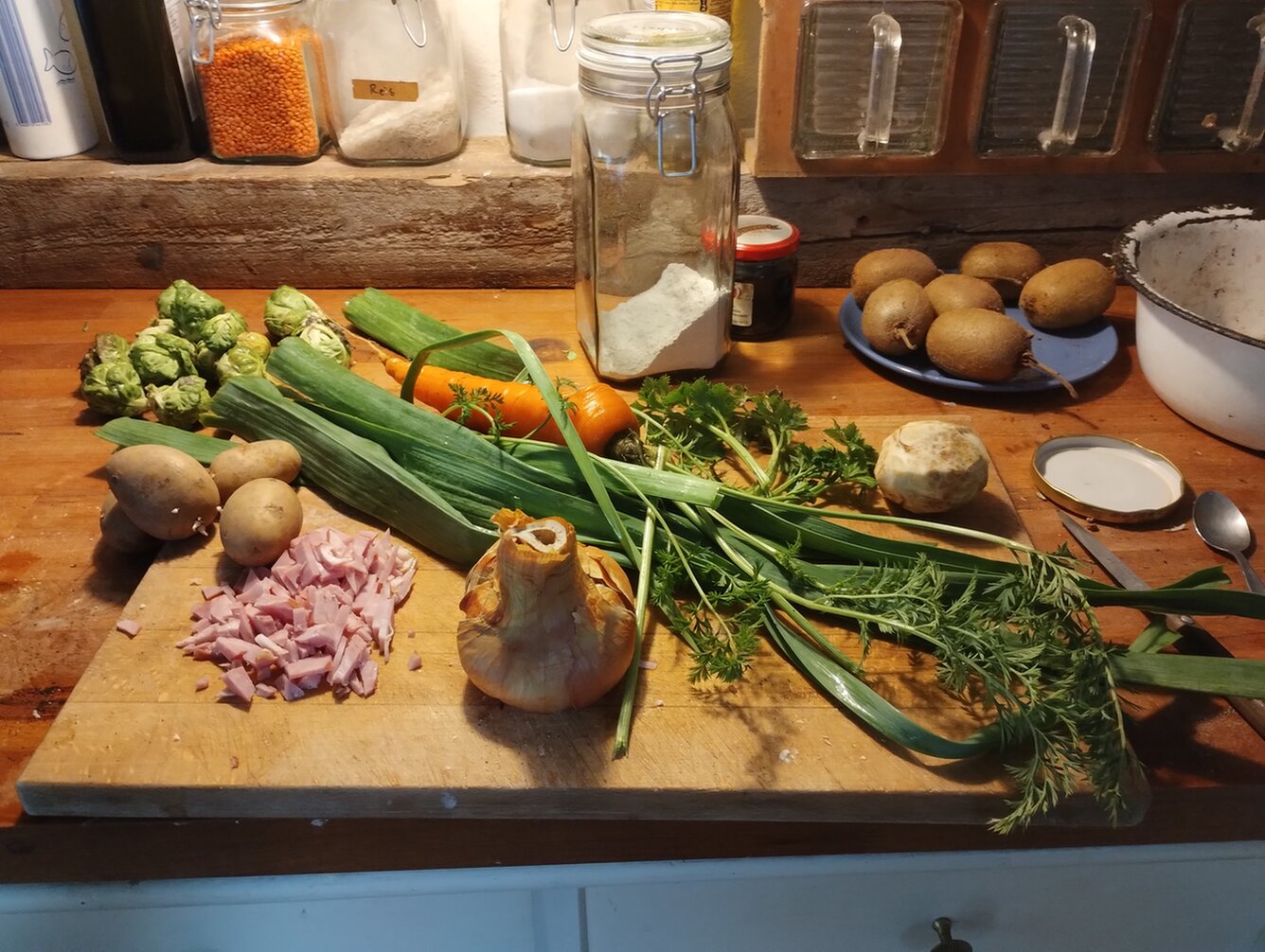 Ganz frisch konnte ich zumindest aus Kübeln, die nah am Haus standen und nicht von einer dicken Schneeschicht bedeckt waren, Staudensellerie für die Suppe ernten und habe gestern meine letzten eingelagerten Rote Beete verarbeitet. Die eingelagerten Kürbisse sind eine mega Bereicherung auf dem Speiseplan, ich wusste gar nicht was man alles aus Kürbissen in der Küche zaubern kann. Fantastisch!