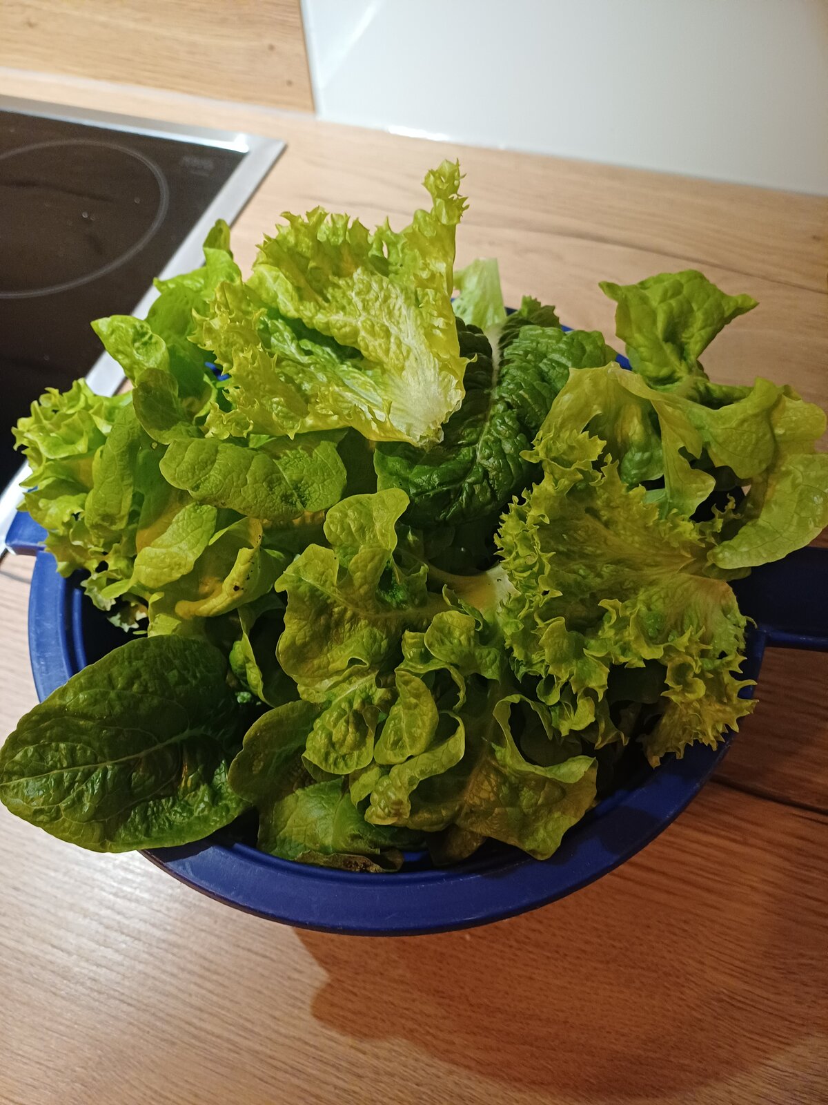 Im Gewächshaus hat der Pflücksalat den Frost erstaunlich gut überstanden. Am Sonntag gab es nochmal eine große Schüssel.