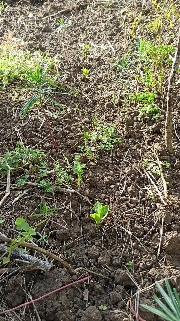 Dann gibt es Pflänzchen mit dem zweiten paar Blätter und eine die ich zur Permakultur rechne. Die steht allerdings auch feucht und etwas geschützt. Sie hat sich da selbst gesäht. Die Samen habe ich reifen lassen, dabei sind wohl welche ausgefallen.
