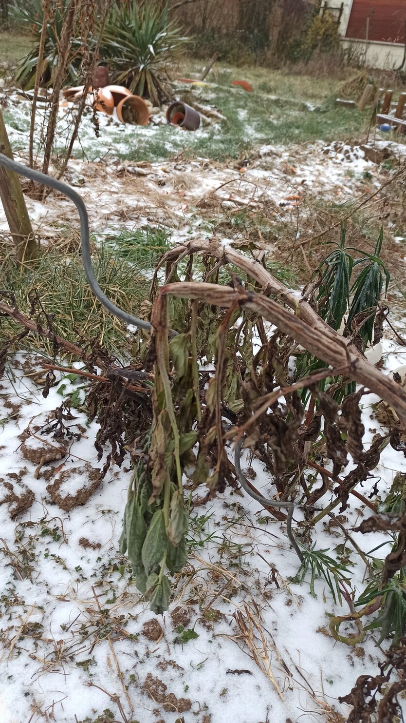 Genauso wie die schwarzen Winterrettich. Zum Teil säen sie sich selbst aus, z. T. gesät nach dem Entsorgen der Tomaten. Die werden nicht mehr so riesig, sind sehr Frost stabil und haben gutes Grün.