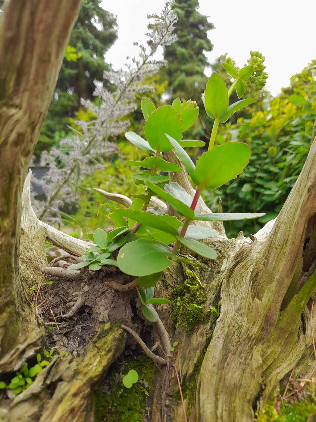 Dieses kleine Fetthenne hat auf der Wurzel fußgefasst