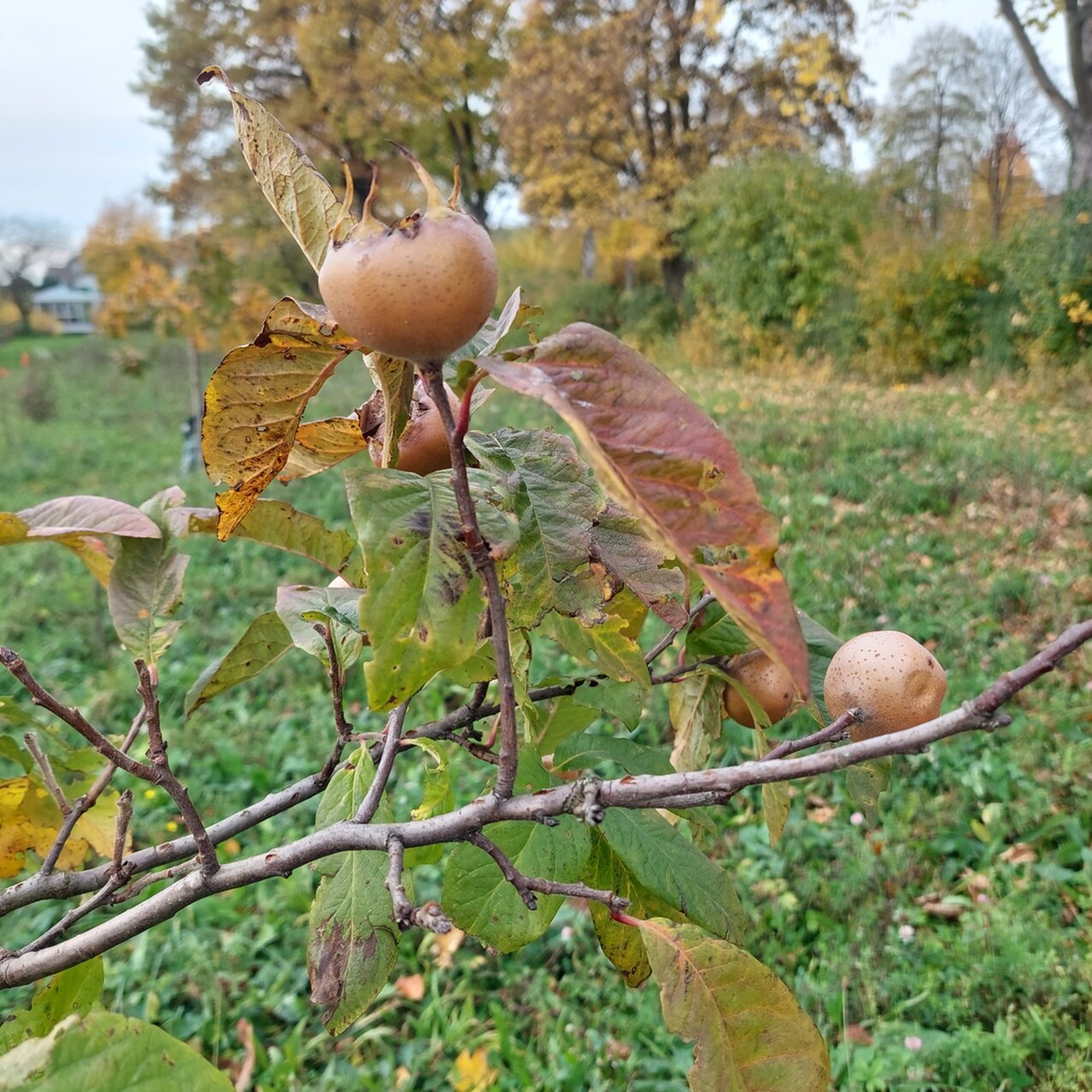 Unsere gepflanzten Gehölze und Bäume auf der Natur nah dran Wiese haben sich super entwickelt. Die Wildäpfel (sylvestris malus) hatte schon kleine Äpfel, die jedoch jetzt weg sind, wohin auch immer. Der Knüller sind die 2 Mispelbäume, die voll Früchten hängen und das jetzt im 2. Herbst. Die Blüte im Frühjahr war ebenfalls ein Hingucker.
