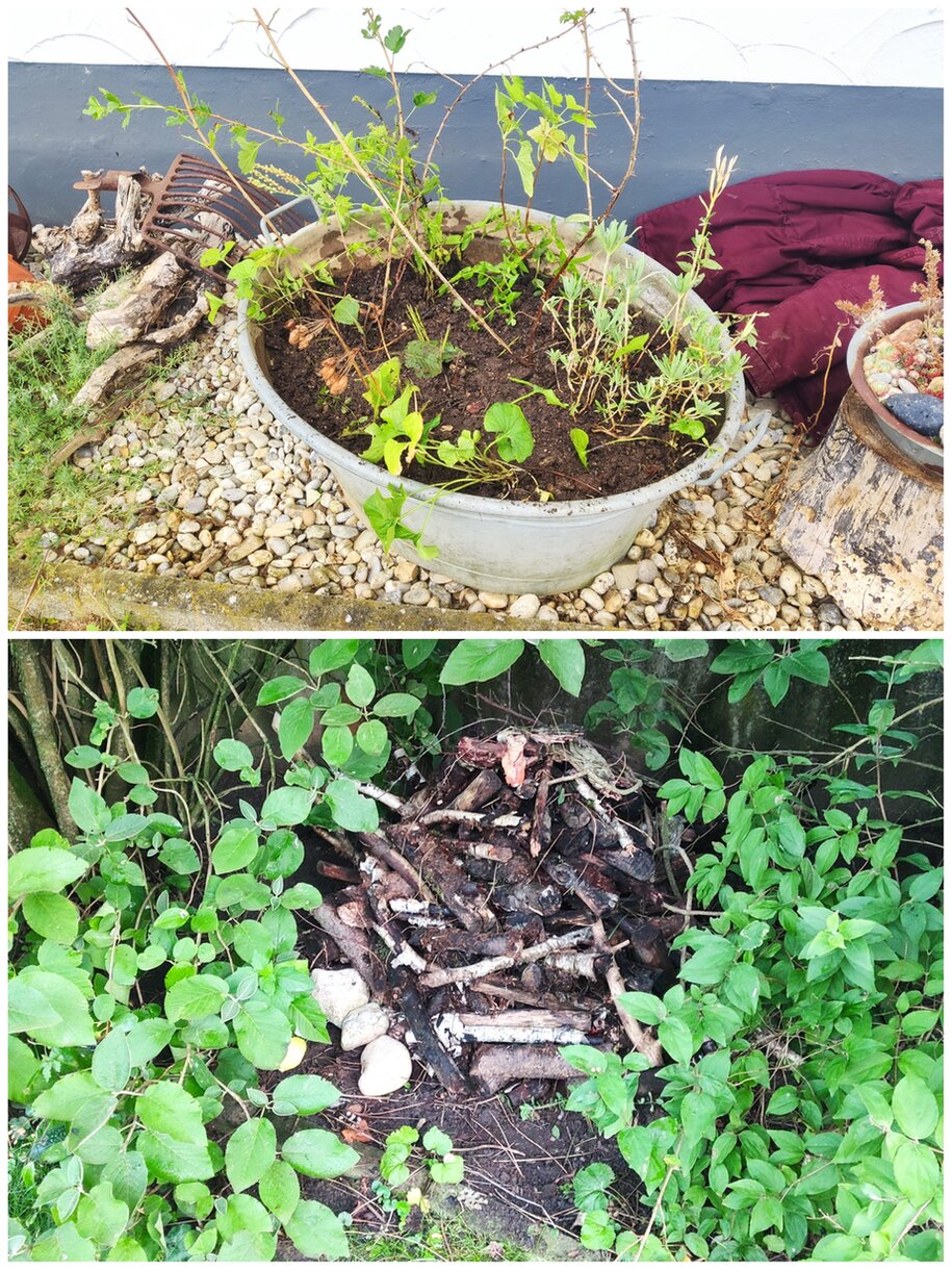 Da ich mich letztens dazu entschlossen hatte die Blaue Kugeldistel rauszuschmeißen, musste ich einige andere Pflanzen, die von ihr unterdrückt wurden, aus dem Beet " zwischenparken". Ich möchte das Beet nochmal umgestalten und neu bepflanzen. Eine alte Zinkwanne, die ich vor längerer Zeit mal geschenkt bekam, war mir nun erstmal dafür dienlich. Auch noch zwei kleine Stachelbeer-Ableger und irgendeine Johannisbeere, die sich von selbst eingefunden hat, kamen dazu. Und...ein neuer Totholzhaufen in der Pufferzone kam dazu.