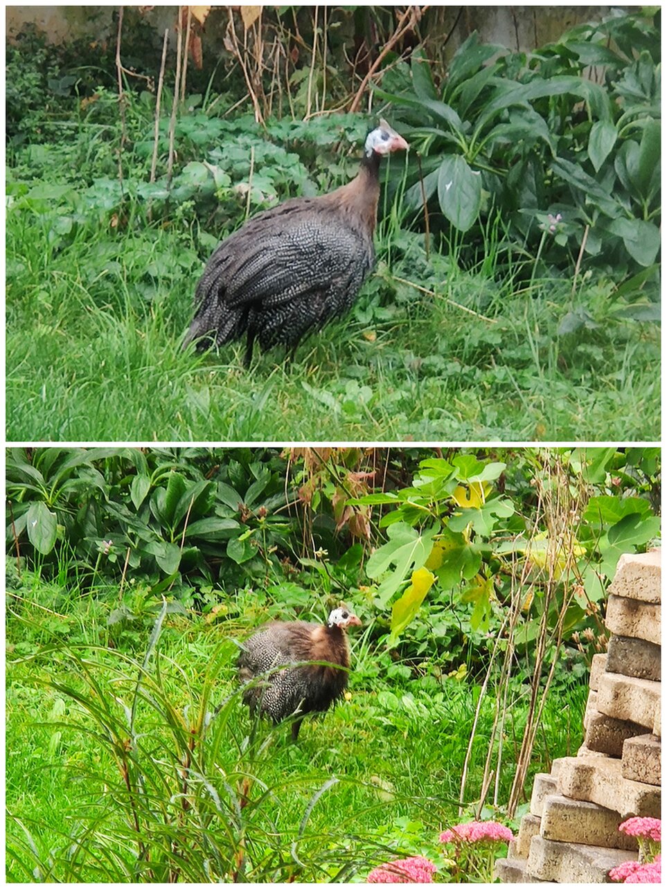 Vor ein paar Tagen hatten wir ein Perlhuhn zu Besuch im Garten. Wir vermuten, dass es irgendwo in der Nachbarschaft ausgebüchst ist und sich nur kurz bei uns ausgeruht hat. Auf jeden Fall haben wir nicht schlecht gestaunt, so ein Perlhuhn sieht man nicht so häufig, die sind eher in Afrika beheimatet.