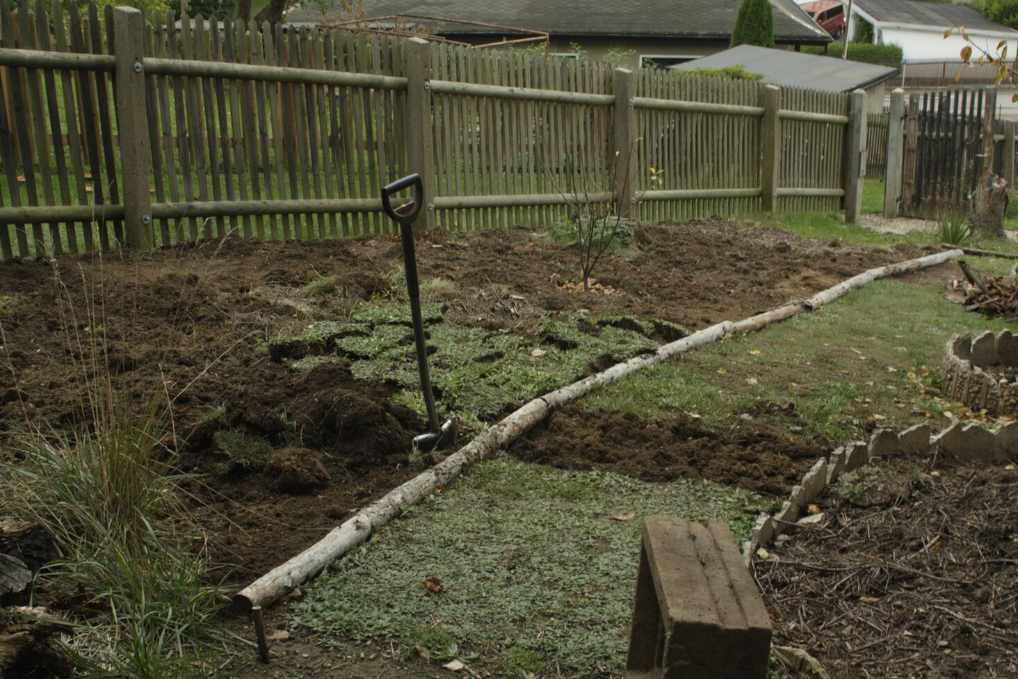 Für den Boden brauchte ich etwa 1,5 Tage. Ich grub selektiv um. Zwischendurch stellte ich mir die Frage, warum ich das mache, und ob das wirklich notwendig ist. Gras umzugraben gereicht nicht zur Freude. Ich hatte während der letzten 3-4 Jahre versucht, dort eine Blumenwiese zu etablieren. Das Gras war aber zu stark. Wo schon ein schöner Blumenbestand am Zaunstreifen war, ließ ich den Boden unberührt.