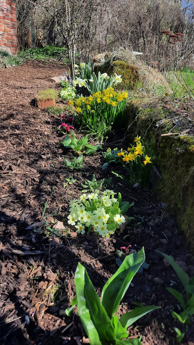 Mittlerweile bin ich viel gnädiger und wohlwollender den Primeln gegenüber als bei Hauskauf. Besonders im Vorgarten, wo ich nicht mehr eingegriffen habe, haben sich die nettesten Farbtöne in unmittelbarer Nachbarschaft zueinander entwickelt. Im Moment eher ungewöhnlich ist ein sattes Gelb, wie man es von den klassischen Osterglocken her kennt.