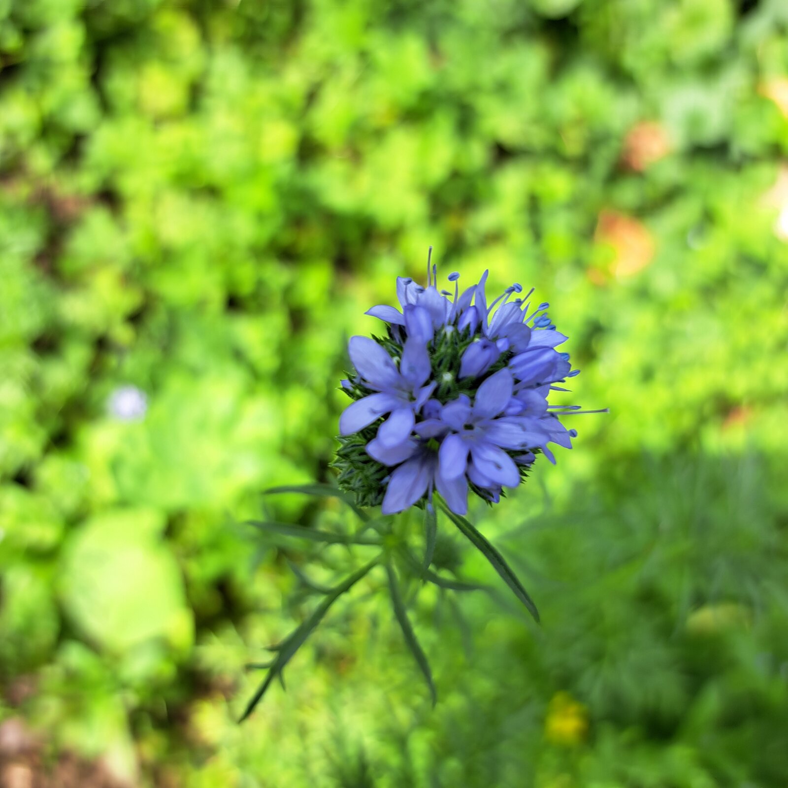 Diese Pflanze entstand wohl aus Vogelfutter (Kleinsämereien) vergangenen Herbst in einer Fuge. Sie sah aus wie ein kleiner Eisbergsalat, überstand den nassen Winter und auch die Frostnächte völlig unbeschadet. Es war im Frühling nicht ein brauner Fleck auf dem Mini-Eisbergsalat zu sehen. Sogar die Schnecken ließen ihn völlig links liegen. Dann begann das Eisbergsalätchen in die Höhe zu schießen, bis auf 1,50 m. Und seit gestern ist dort die herrlich blaue Blüte zu sehen, ohne Zweifel handelt es sich um ein Zichoriengewächs. Der kleine Kopf am Anfang war so klein wie ein Radicchio, nur eben ganz in Grün.