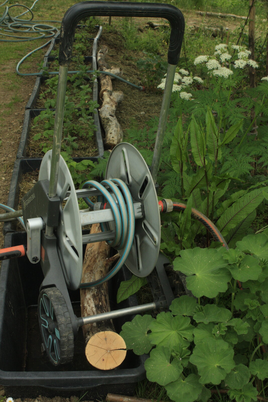 Ich wässerte die Tiny-forrest-Hecke und andere Teile des Wäldchens wieder mit Poolwasser (letzt Chlorung im September; riecht nicht mehr und ist grün). Aber auch mit quasi 15 IBCs möchte ich bedacht umgehen. Deswegen tropfte der undichte Schlauchwagen zuerst in den künftigen Teichtrog und dann ins Beet. Das Reinfallhinderniss funktioniert jedenfalls.