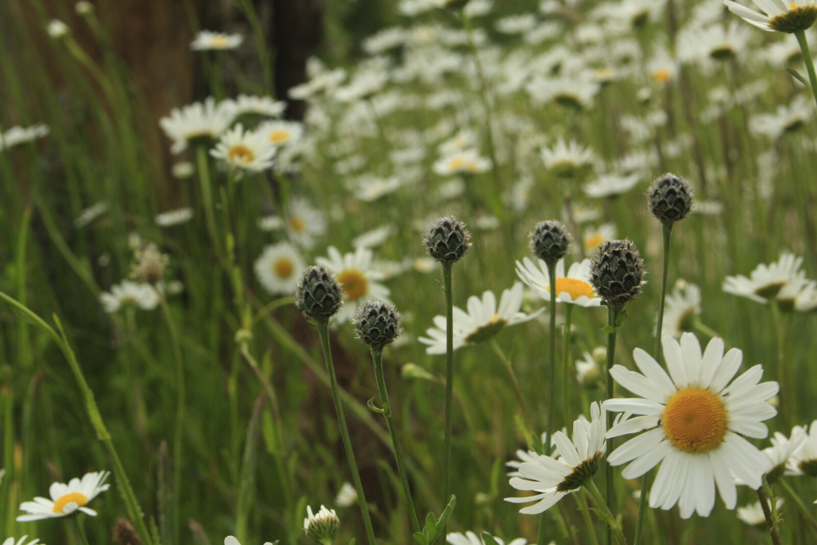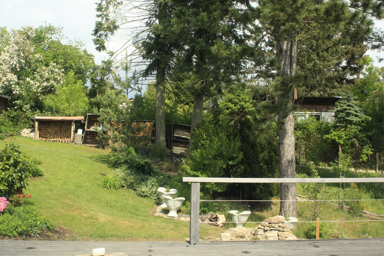 Hauptwerk war die Fläche am Pooleingang, für die ich den letzten Viertelquadratmeter Aushub siebte. Ich säte wie unterhalb des Pools den Blumenrasen M9 von Syringa ein, stellte den Sprenger auf und ließ bei SchwieVa zwecks regelmäßiger Wässerung nachfragen. Nach vier Jahren ist die Baustelle fertig. Sie erinnerte mich an ein Mantra einer Kunstlehrerin: Am Ende des Unterrichts muss das Werk aussehen, als sei es fertig. (Der Betrachter weiß ja nicht, was/ wie es hätte werden sollen). Die restlichen rumliegenden Arbeiten/ Materialien liegen schon so lange, sind quasi schon eingewachsen und sehen wie gewollt aus. Für den Rest des Gartenjahres heißt es also: Alles kann, nicht muss.