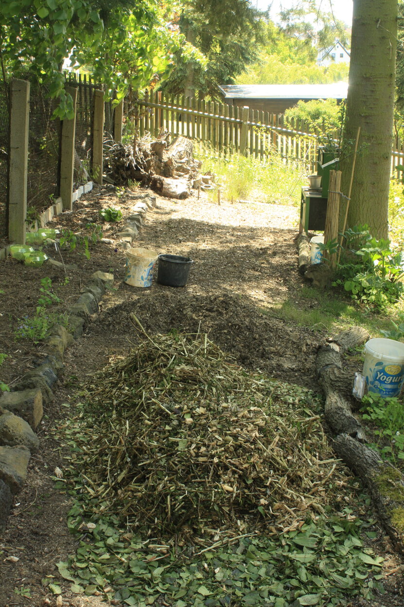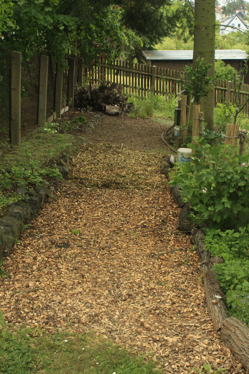 Forsythie und Kirschlorbeer wurden gehäckselt. Der Mulch auf dem Weg dient mir nach zwei bis drei Jahren als Mulch auf Beeten; Flächenkompost quasi. Also gab es einen Austausch. So stimmt die Aussage, dass Hackschnitzelwege weniger Bewuchs haben, weil der Zersetzungsprozess anfangs den Stickstoff bindet, wieder. Oft packt mensch einfach neue Häcksel oben drauf und wundert sich dann über das sprießende Grün.