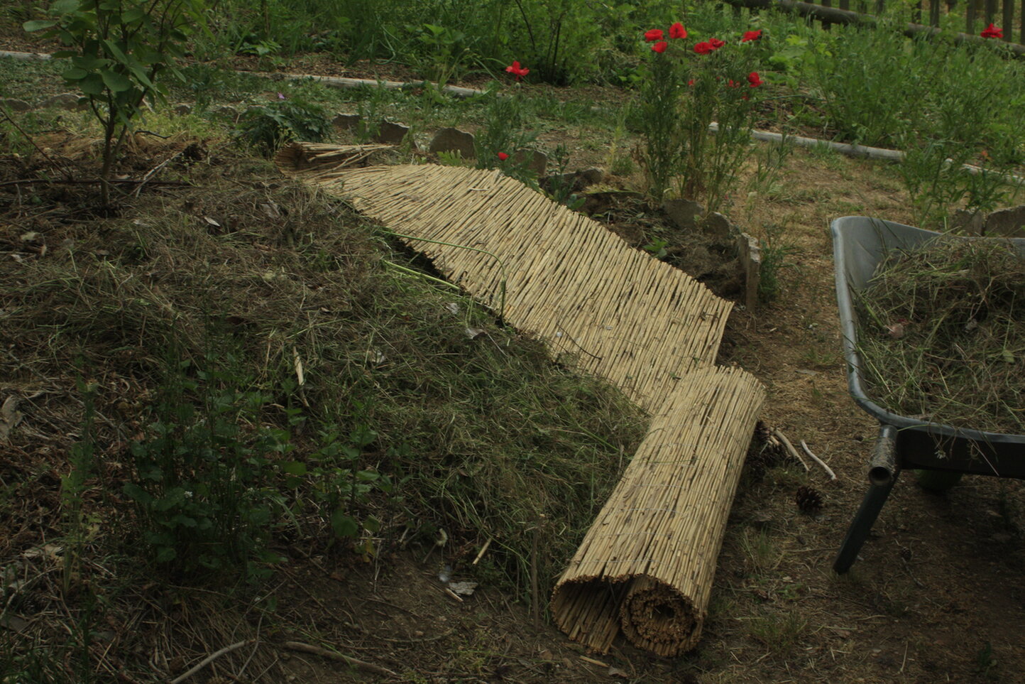 Im Wäldchen gibt es noch einen markant trockenen Streifen. Die Böschung und gesetzte Pflanzen werden gern vom Marder abgetragen. Saatgut keimt auch nicht. Die Schilfmatte nahm in der Gerätehütte viel Platz ein. Und dann gibt es ein Video von Markus Burkhardt über die Anlage von Blumenwiesen am Hang. Als Stecken benutzte ich Nadelgehölz, das mit seinem natürlichen Wuchs Widerhaken macht. Unter die Matten legte ich Rasenschnitt in der Hoffnung, dass er die Feuchtigkeit ein wenig hält.