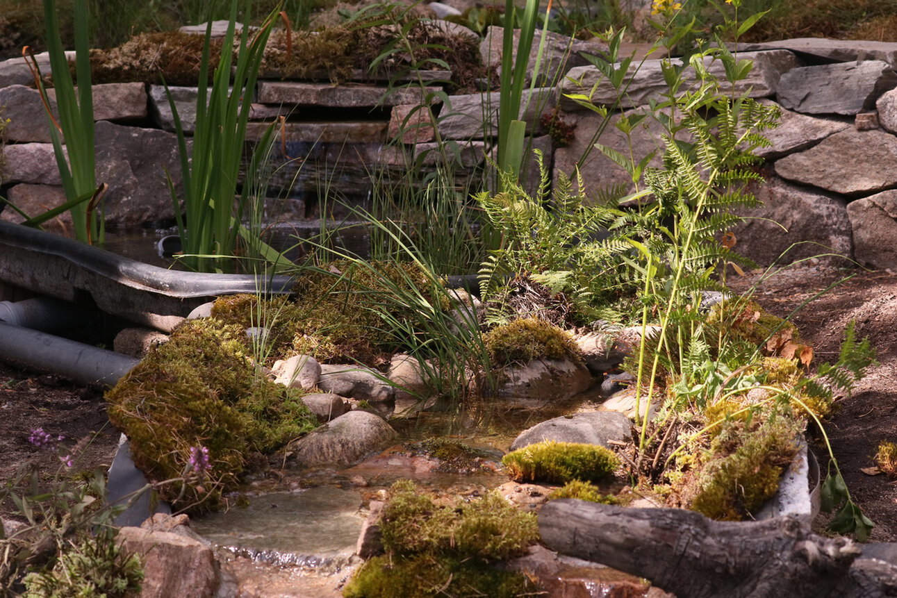 Man kann wirklich glauben, dass sich der Bach dort fortsetzt. Ich werde dahinter noch einen Kübel eingraben und mit wechselfeucht liebende Pflanzen versehen. Dann wirkt es noch mehr.