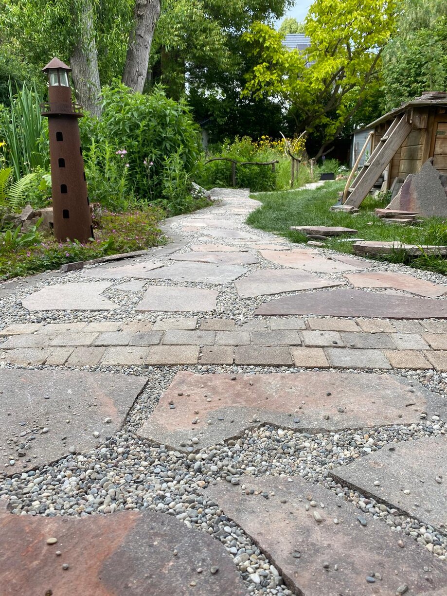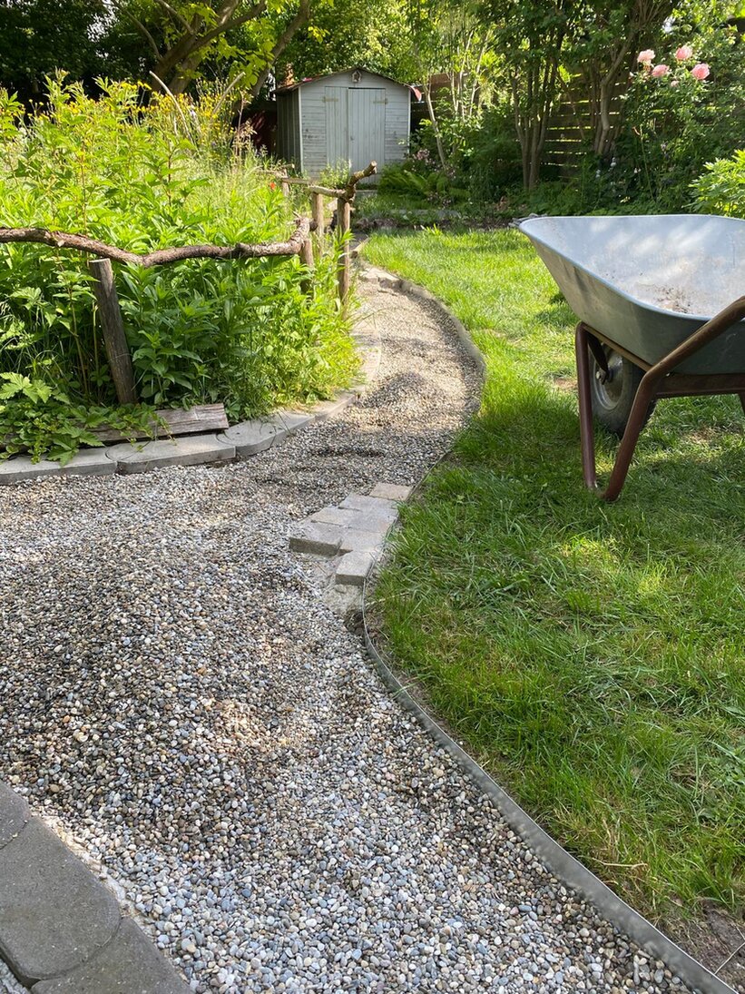 Den Weg haben wir in den Wochen davor, vorbereitet: Grasnarbe weg, Wegränder vorbereitet mit Beetbegrenzungen und Reste unserer Hofplatten verarbeitet. Da wir außerdem ein Magerbeet integrieren wollten, trugen wir auch dort die Grasnarbe und 30 cm Boden ab. Auf den Kies kamen Polygonalplatten, die leider nicht ganz ausreichten.