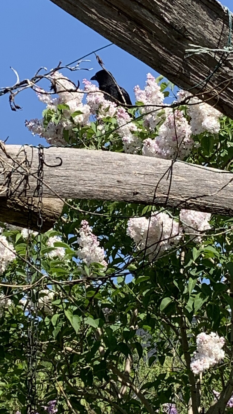 Die Krähe kommt ständig zum Flieder und futtert Blüten. Sehr seltsam!