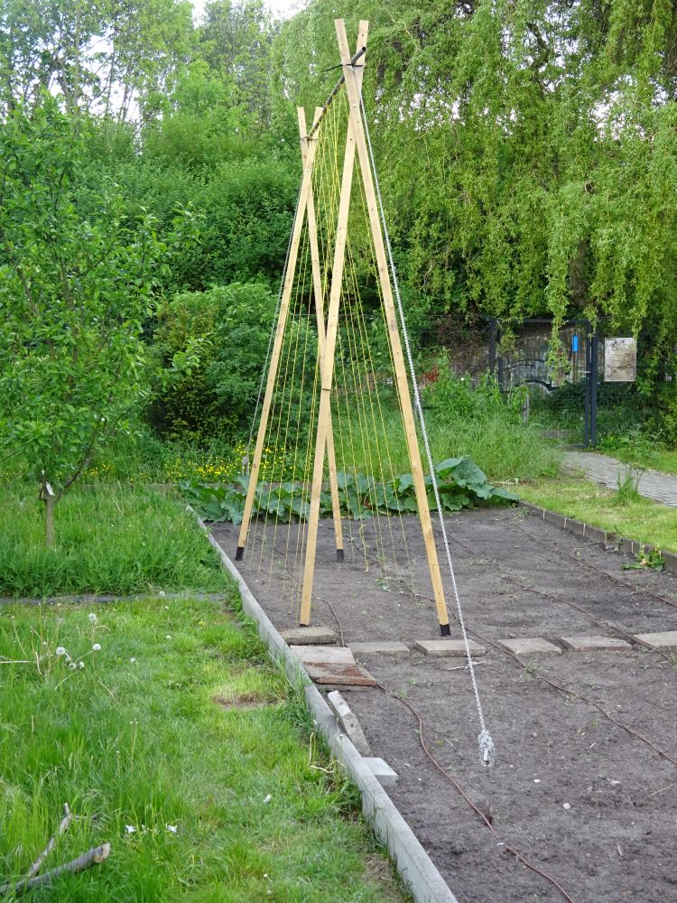 Unser Bohnenrankgestell haben wir auch schon aufgebaut. Ist etwas groß geworden und vom Besucher eines Nachbarn kam wohl schon die Frage, ob wir eine Gärtnerei betreiben würden. Naja, so groß ist es nun auch wieder nicht.