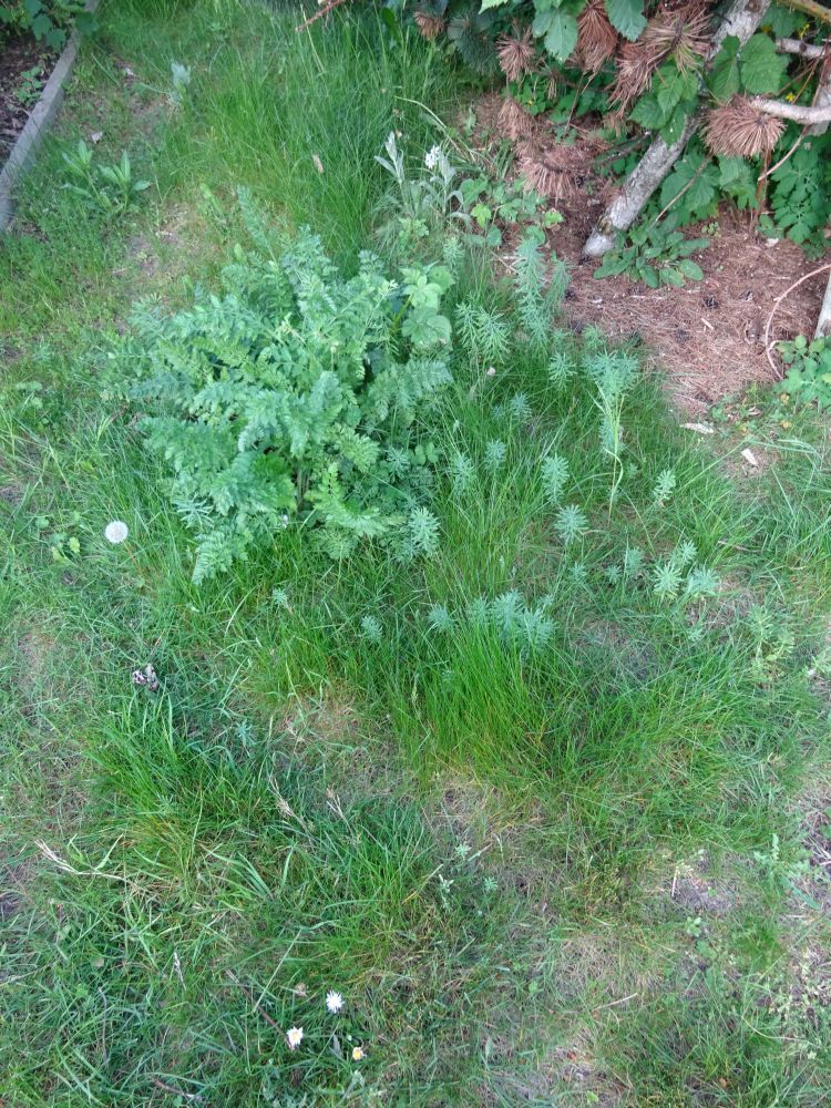 Letztes Jahr hatte ich einige Inseln im Rasen ausgestochen und eine Mischung aus diversen Sämereien verteilt. Nicht an allen Stellen hat es funktioniert, aber zumindest an drei Punkten haben sich neue Pflanzen durchgesetzt, allen voran Wilde Möhre, Echtes Leinkraut und zu meiner Freude scheinbar auch der Wiesenknopf. Ich hoffe, dass sich die Pflanzen langsam verbreiten.