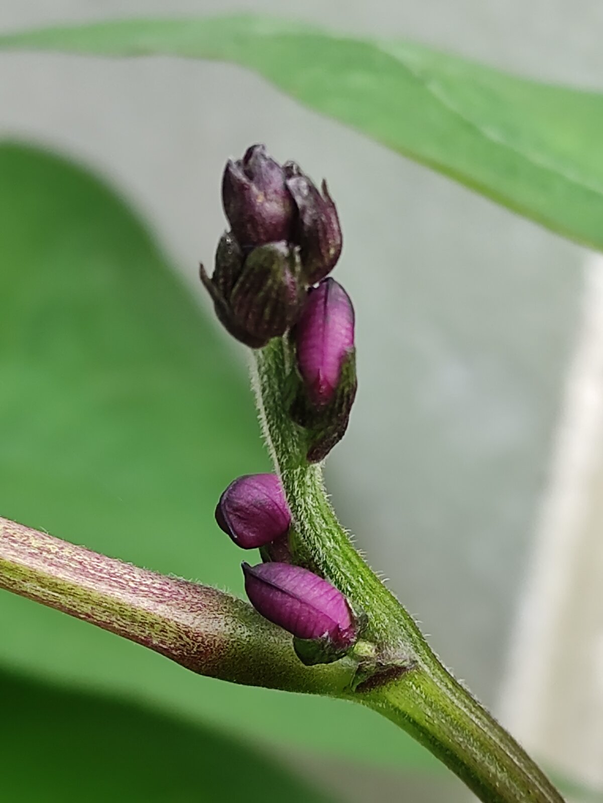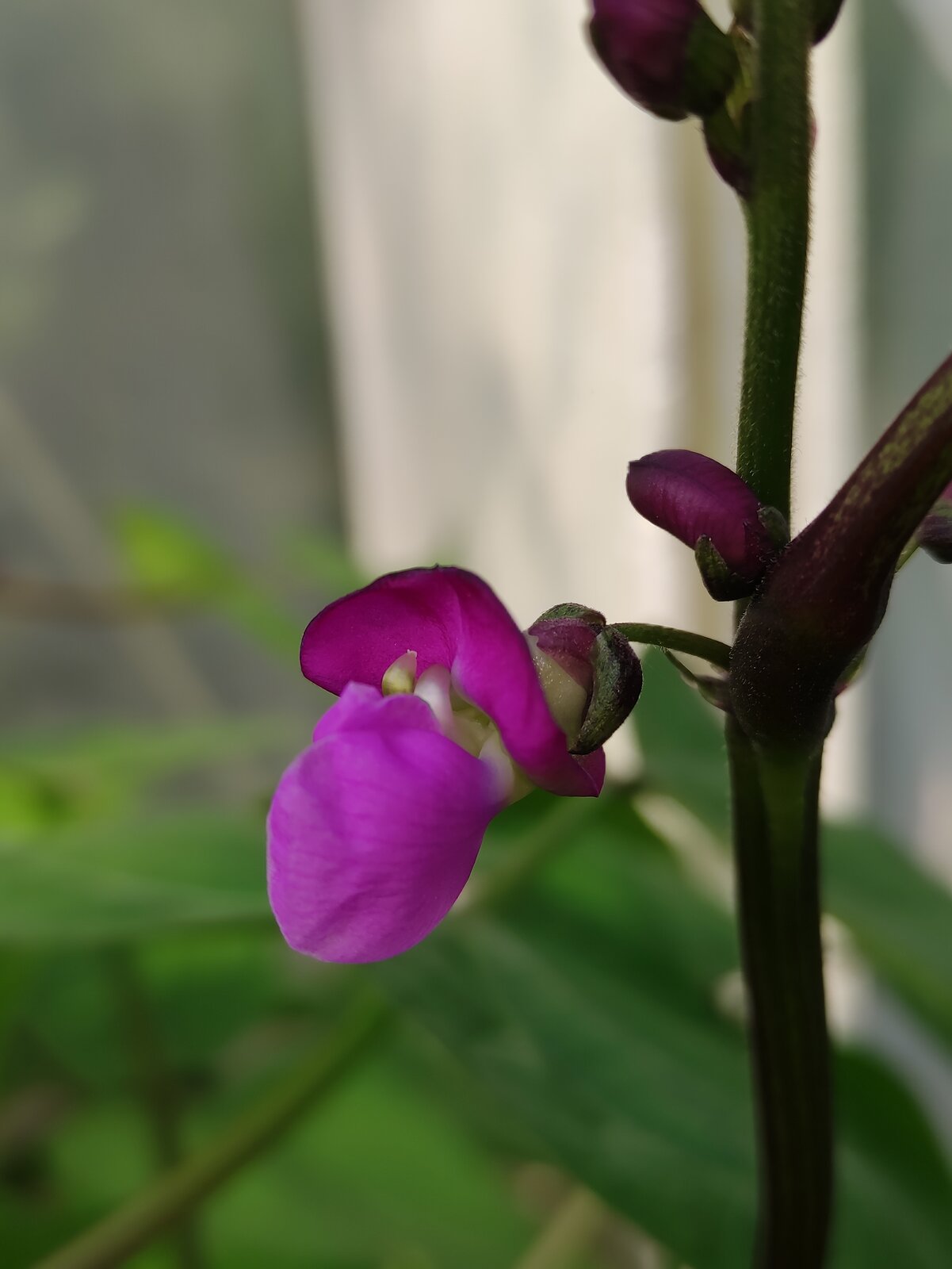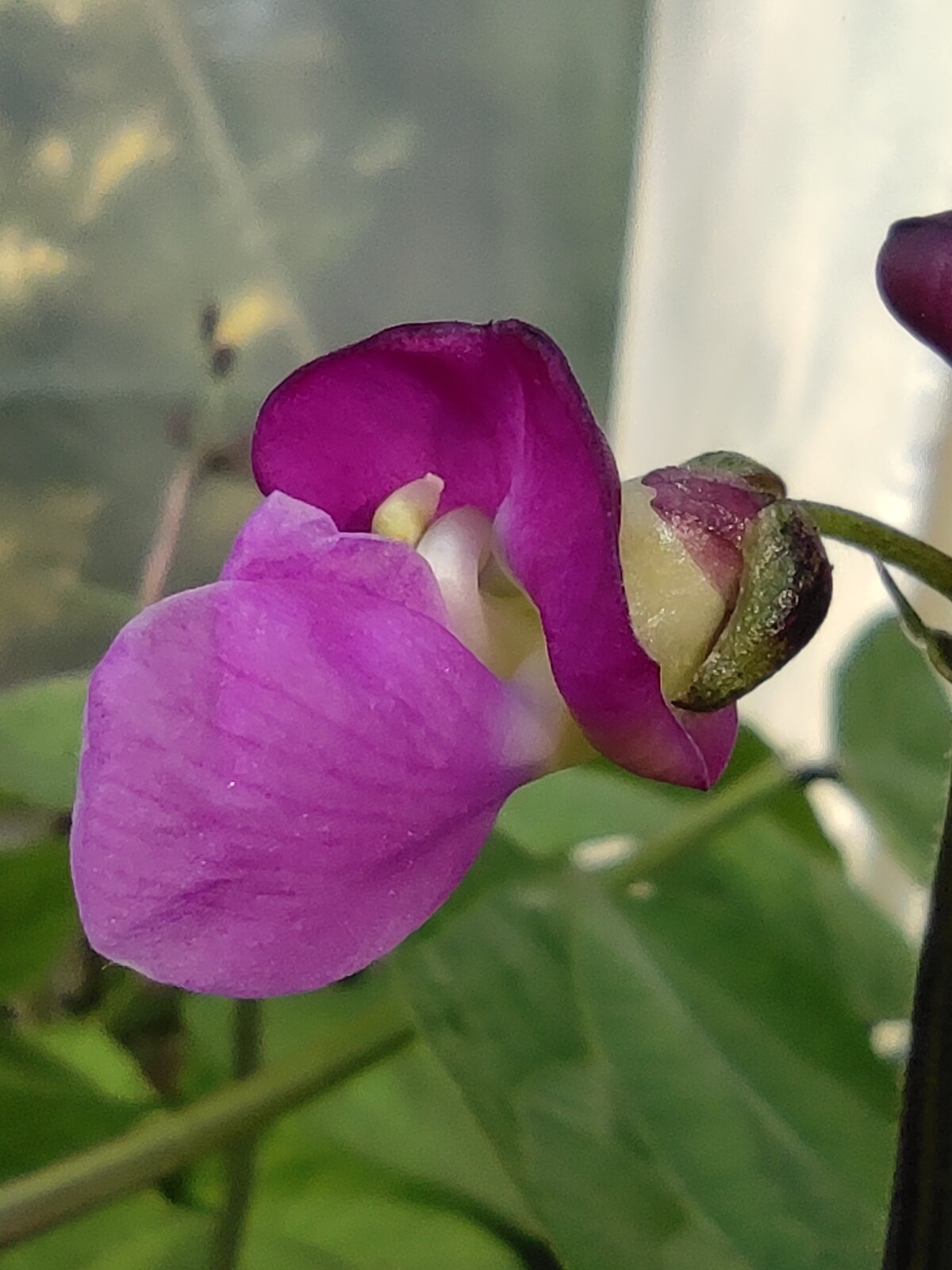 Die Bohnen blühen, es ist die Sorte "Purple Teepee".