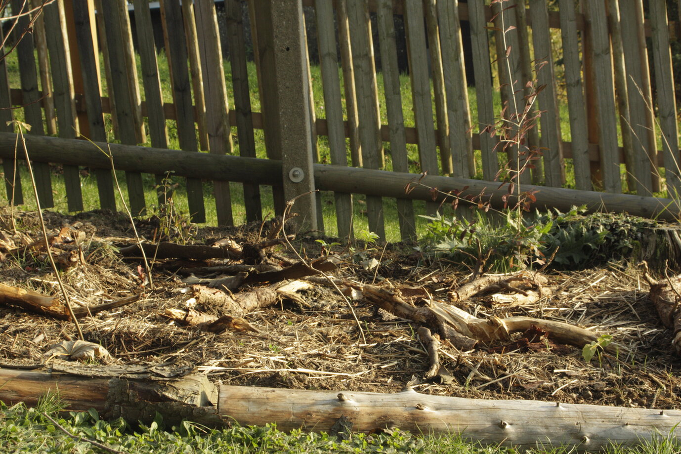 Und ansteckend. Ich bin eben mal meine Ecke unten rechts beim Käferkeller abgegangen. Zwischen Grenze und Strauchinsel (Pfaffenhütchen, Wildapfel, Felsenbirne, die Berberitze hat das vorige Jahr nicht überlebt)sind ca. 5x8m Platz. Das sollte eigentlich die Lichtung werden, an der Grenze wachsen Goldregen und wolliger Schneeball hinterm Käferkeller, Weißdorn davor, und auf dem halben Weg zu den Weiden, die die obere Grenze der Fläche darstellen, noch eine Eberesche. Der rote Holunder (S. Racemosa) daneben ist eingegangen. Ja, die Gehölze sind inzwischen größer, Wildapfel und Eberesche so 3-4m, Schneeball und Weißdorn so anderthalb bis 2, und Felsenbirne und Pfaffenhütchen haben einen Meter gerissen. Gepflanzt '21.