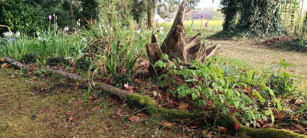 Auch in der Hotspot-Zone hat sich einiges getan. Ganz neu ist ein dreieckiges Inselbeet - Waldhotspot, das ich mit verschiedenen Wald- und Halbschattenstauden bestückt habe. Dort wachsen jetzt unter anderem: Frühlings-Platterbse, Rote Lichtnelke, Klebriger Salbei, Ausdauerndes Silberblatt, Lungenkraut, Süßdolde, Waldziest, Waldgeißbart und als Farbtupfer im Frühling – Tulpen, Narzissen und zuvor der Zweiblättrige Blaustern. Was ich sonst noch an passenden Wildstauden im Garten gefunden habe, durfte ebenfalls einziehen. Auch eine schön verwitterte Wurzel und der Braunwurz ergänzen das Bild.