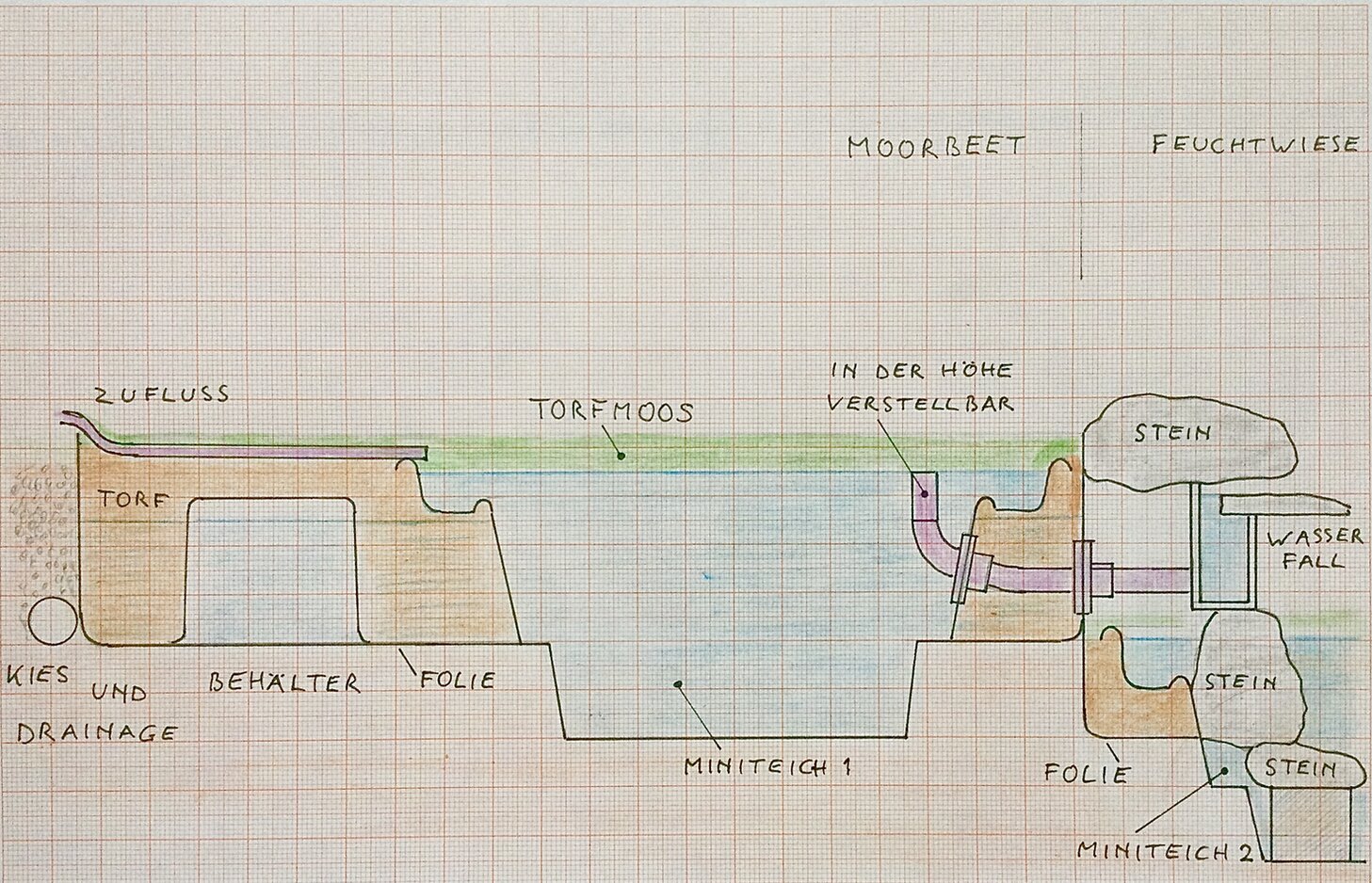 Ich habe ja Urlaub. :pfeiffen Da habe ich auch Zeit ein Bisschen zu zeichnen. Diesmal eine Schnittzeichnung, die zeigt, wie ich mir das so ungefähr gedacht habe. Vorweg muss ich sagen, dass was auf der Zeichnung nicht wiedergegeben ist, ist die Trennung zwischen den beiden Bereichen und der Steg darüber. In Wirklichkeit sollen beide Bereiche einen halben Meter auseinander geschoben werden. Was auf der Zeichnung auch fehlt ist der höhenverstellbaren Abfluss der beiden Bereichen. Vor allem für die Feuchtwiese ist das wichtig, um wechselende Wasserstände nachahmen zu können.
