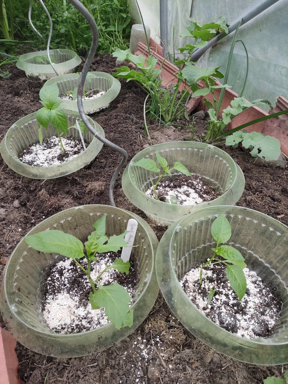 Ich habe die ersten Chilis ins Gewächshaus gepflanzt.