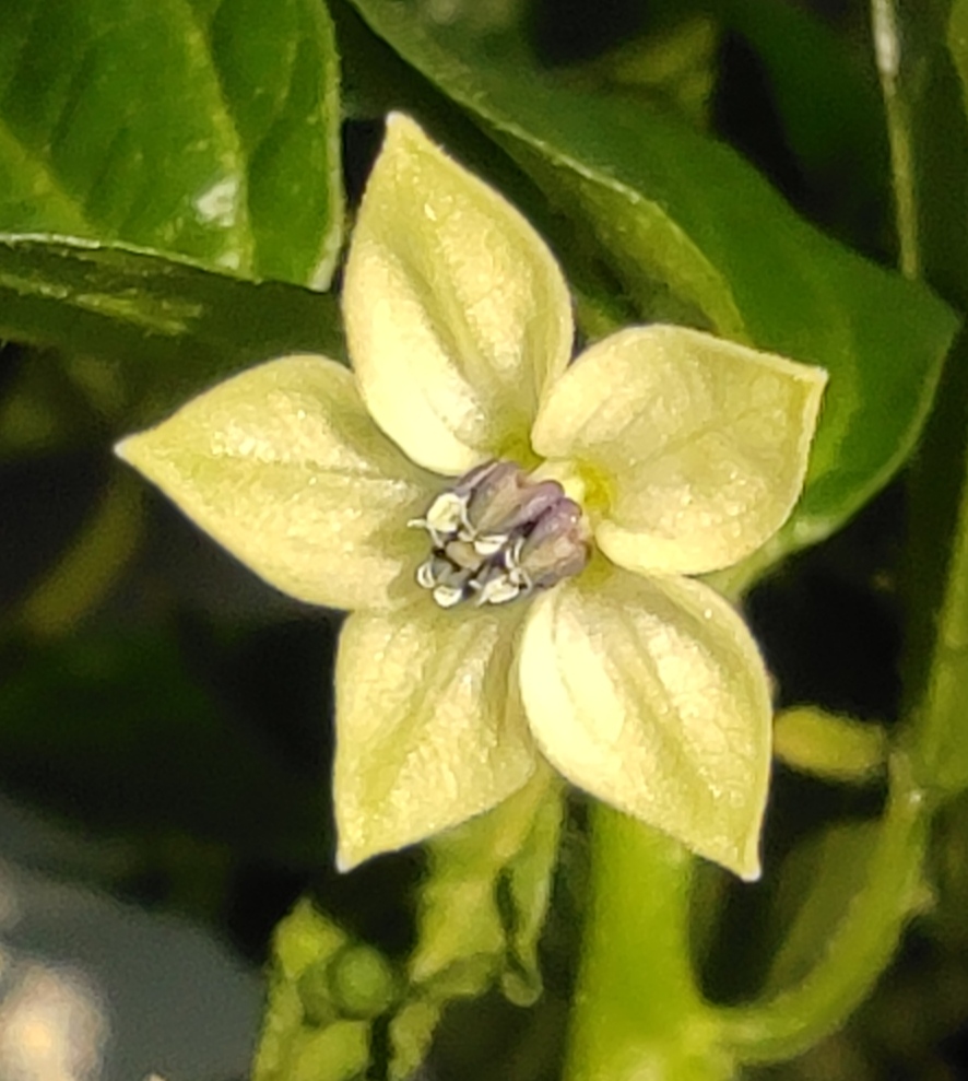 Die Blüte einer roten Habanero (Capsicum chinense), die Pflanze hat auf der Fensterbank überwintert.