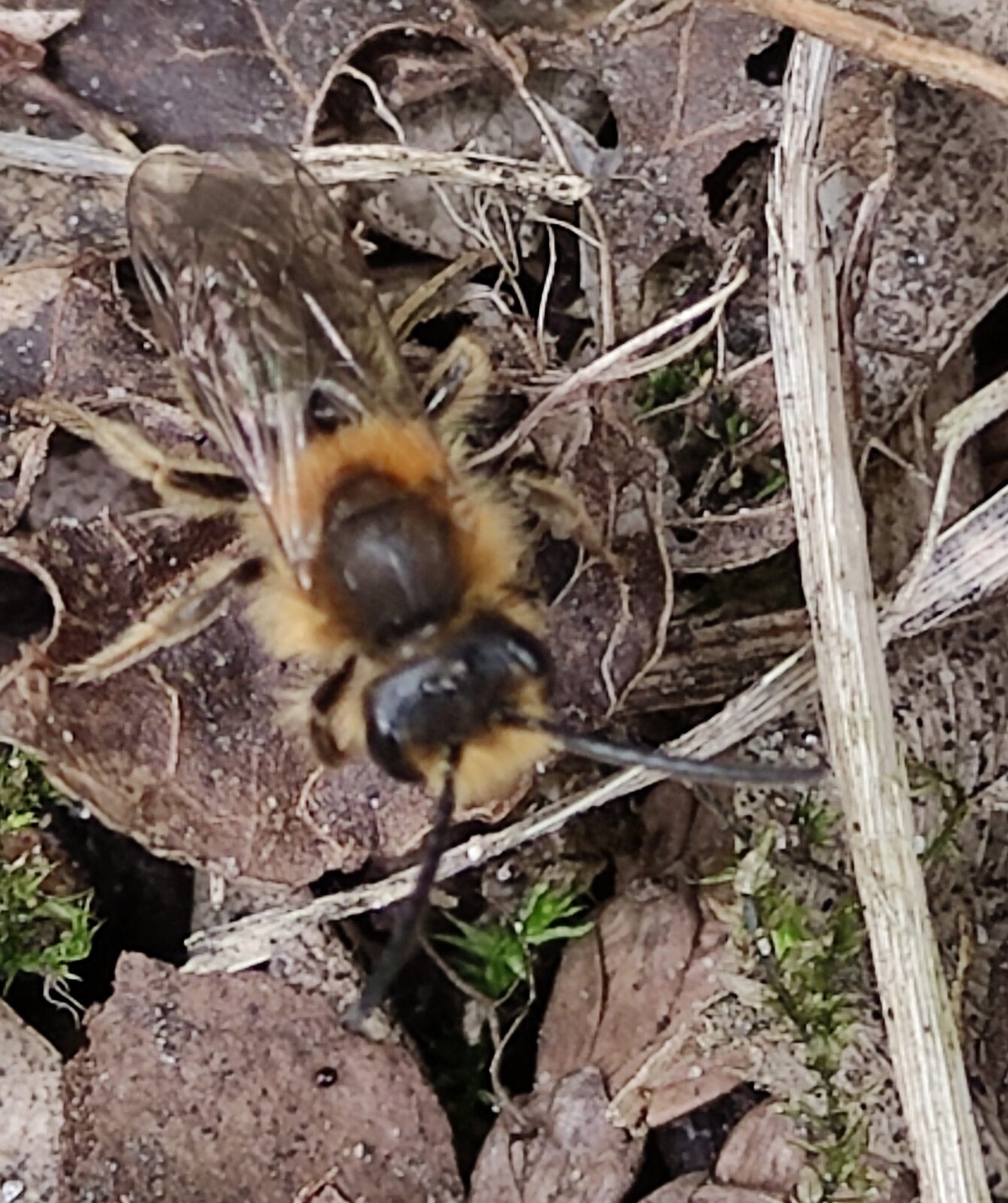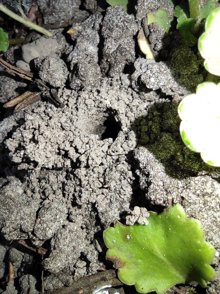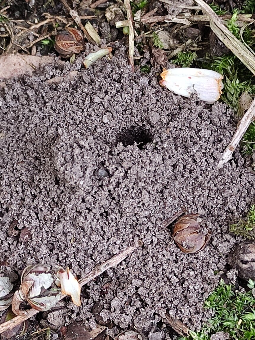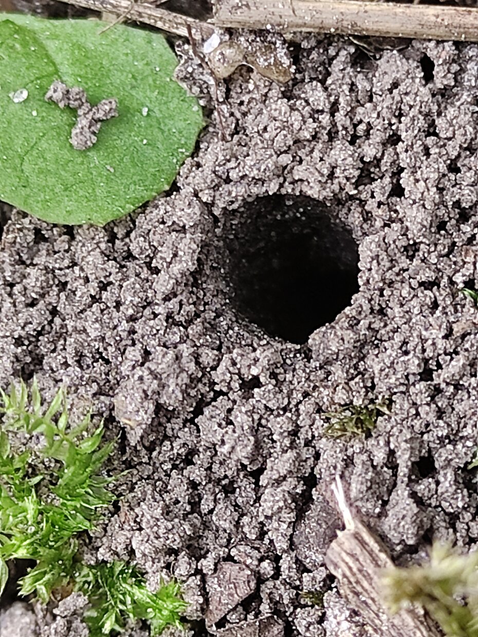 Da mache ich mir Gedanken um bodenbrütene Bienen und die rotschopfige Sandbiene legt ihre Brutröhren unter den Büschen an.