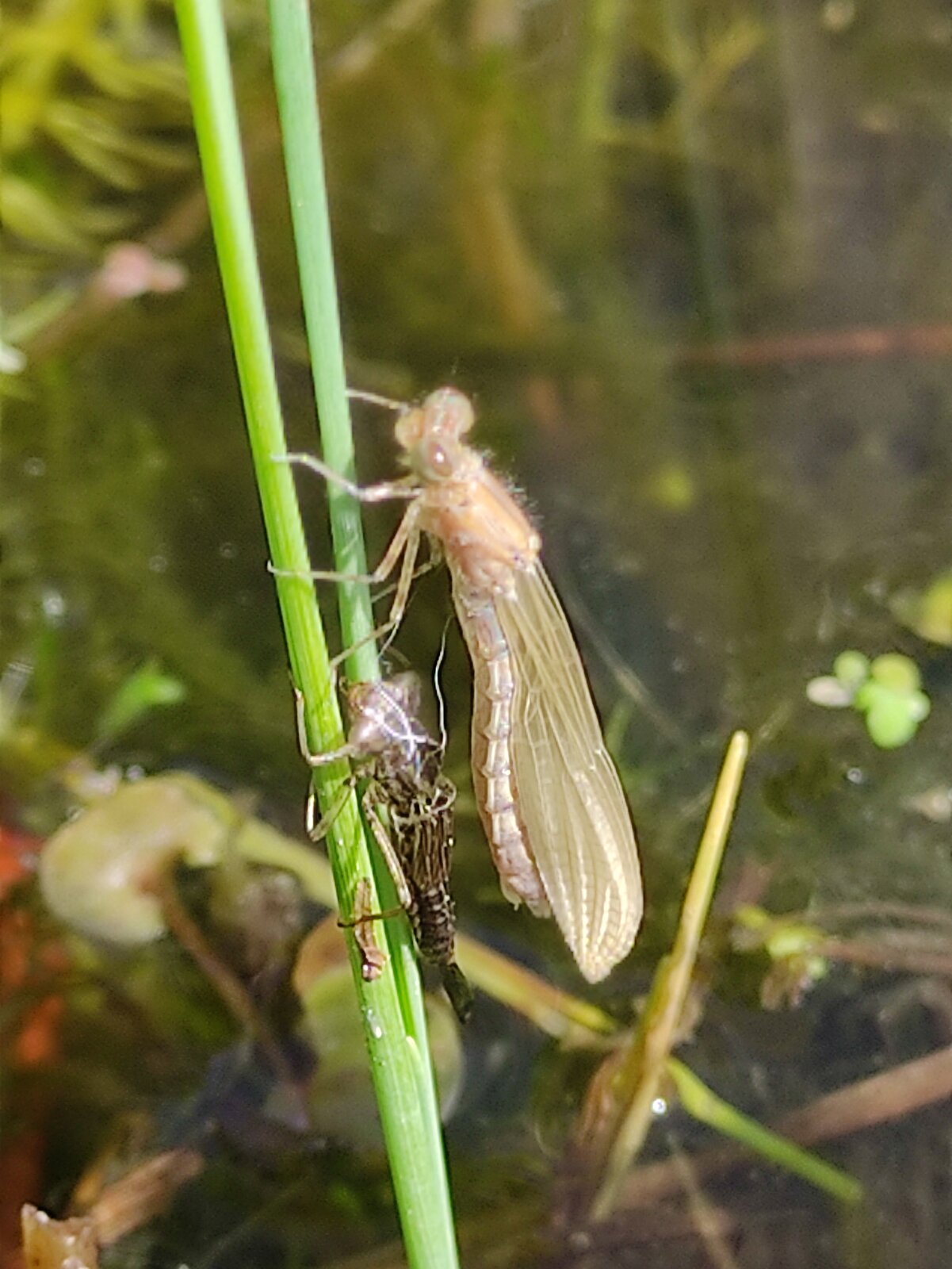 Heute ist Libellenschlüpftag am Tümpel und die Teichfrösche quaken.