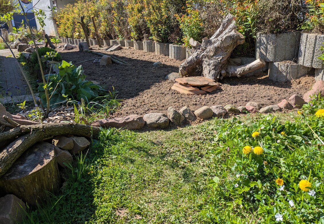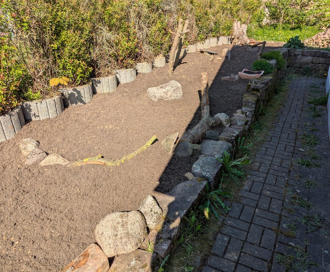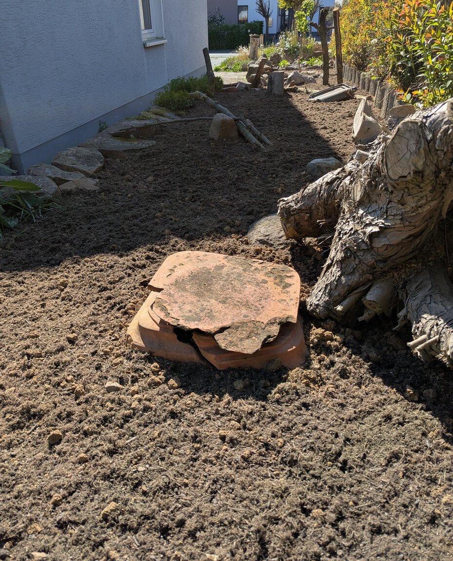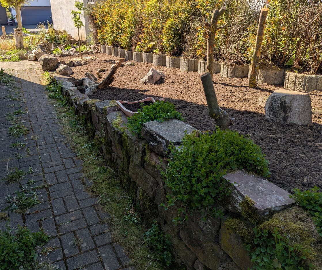 Das Projekt auf der Nordseite ist fertig vorbereitet und wartet auf die Bepflanzung, Ende nächster Woche geht es los. Der Bereich ist 11,8 m lang und 1,7 m breit und seine Anlage hat meine allerletzten Totholzressourcen verbraucht. Die Fläche wird vor allem im Mittelteil durch die Garage beschattet, dort gelangt lediglich die Morgen- und Abendsonne hin und auch nur in dem Teil des Jahres, in dem sie ausreichend hoch steht.