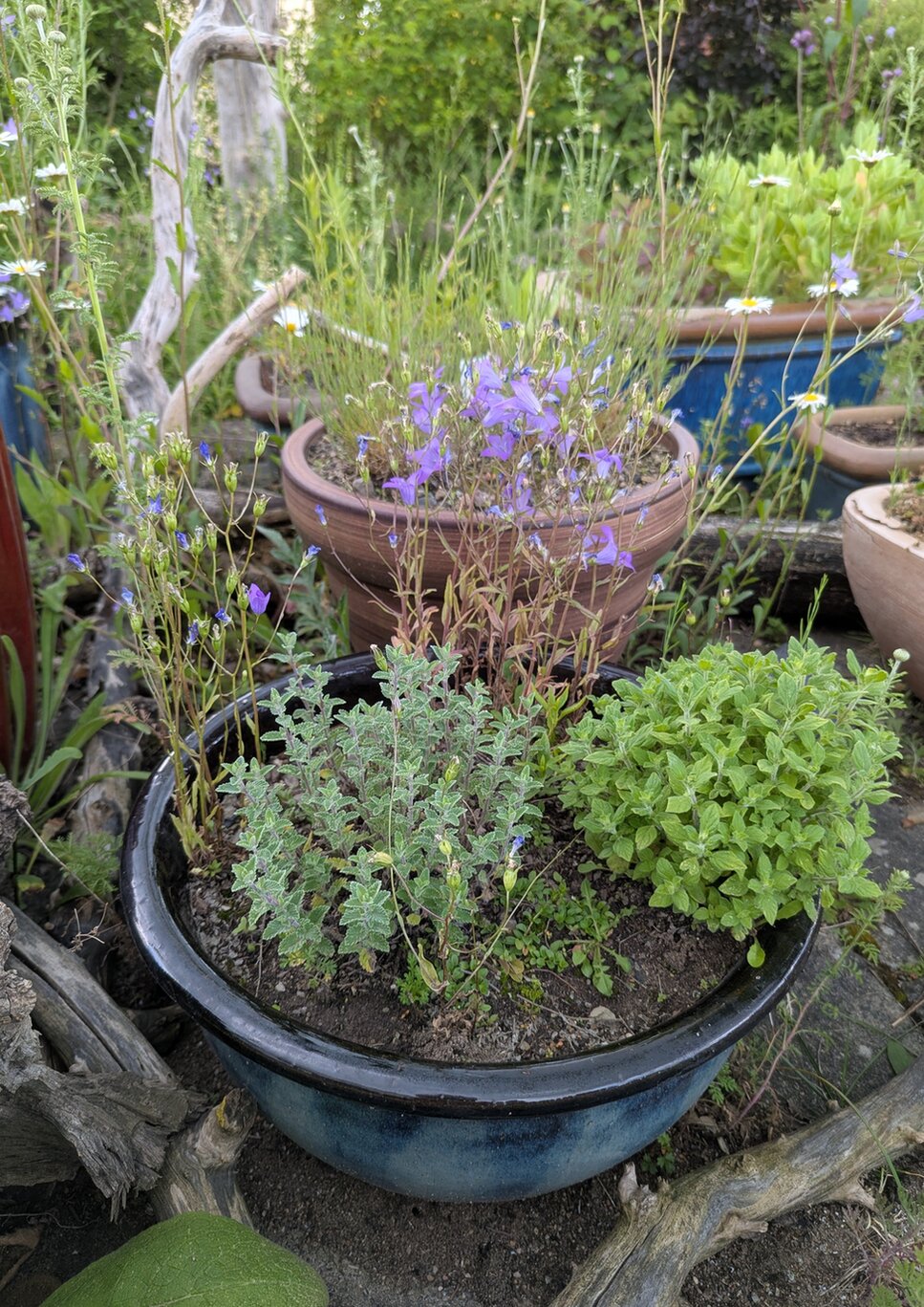 Die drei habe ich dort so allerdings so gar nicht gepflanzt. Vor zwei Jahren war das ein Katzenminzentopf, die sieht man jetzt noch im linken Bereich. Dann kamen die Ameisen von unten in den Topf und haben ihn komplett ausgehöhlt. Das fand die Katzenminze nicht so toll, ich wähnte sie schon im Jenseits. Dieses Jahr ist sie wieder da, vergesellschaftet mit "Calamintha nepeta / Kleinblütiger Bergminze" (rechts davon) und rundherum "Campanula patula / Wiesen-Glockenblume".