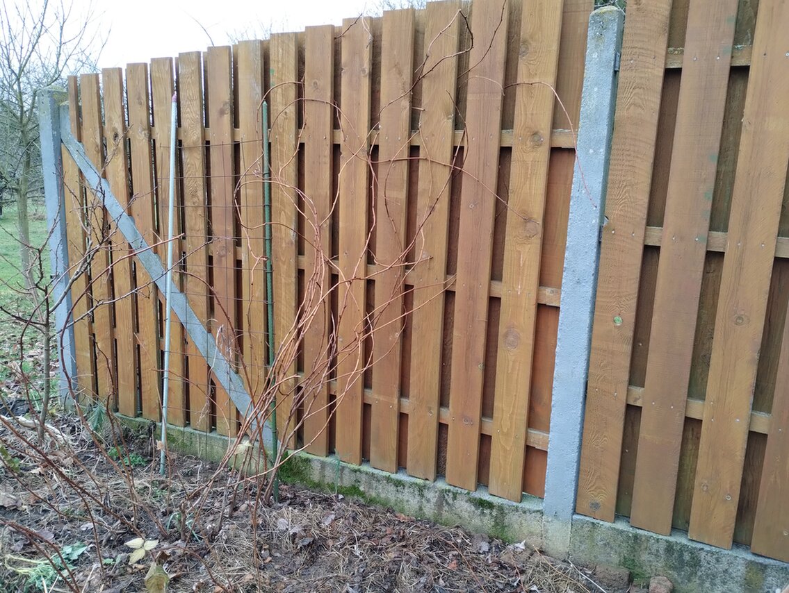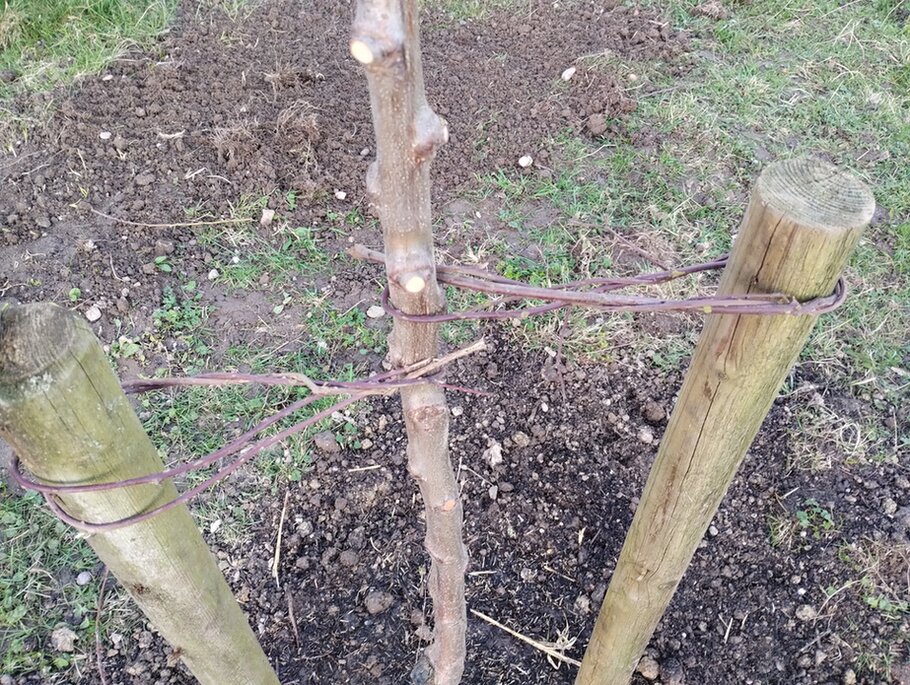 Angebunden habe ich ihn laut euren Tipps mit Brombeerranken. Dünne Ranke, Blätter und Dornen abgestreift (mit Handschuhen). Sieht gut aus!