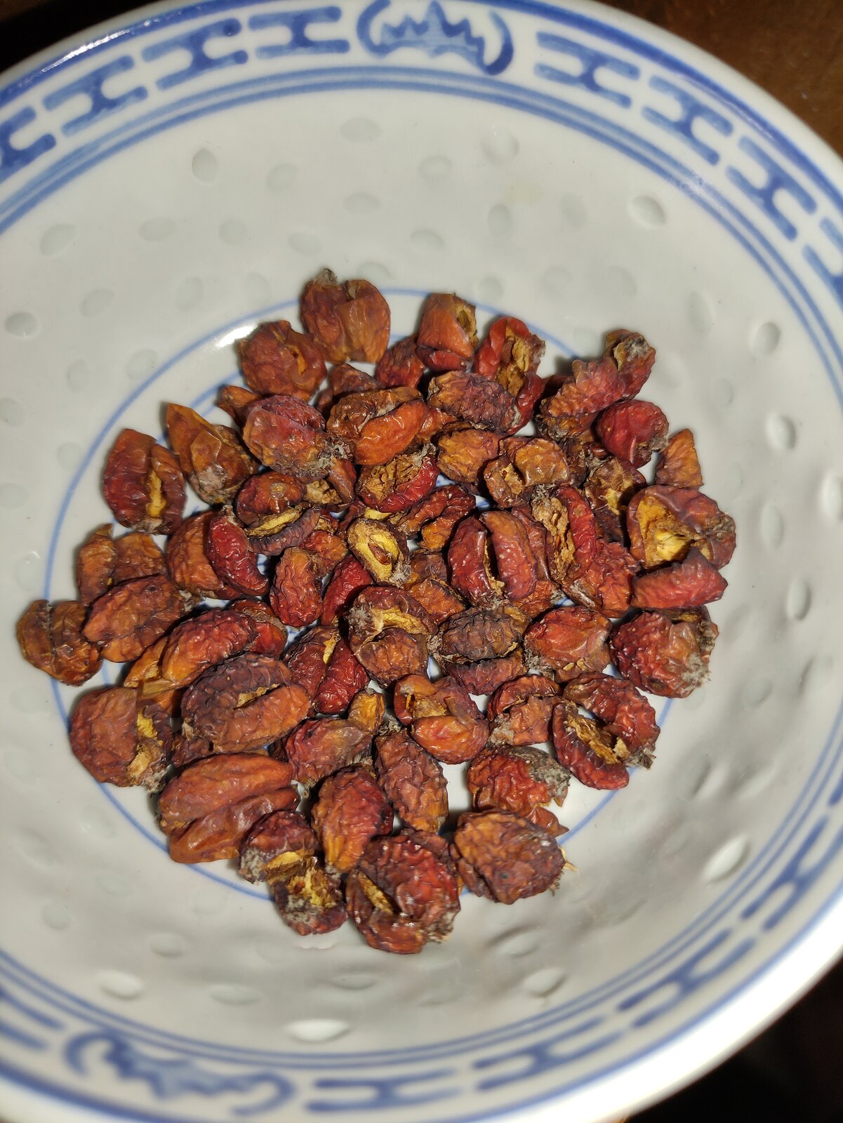 Ich habe getrocknete Mehlbeeren gemahlen. Die haben einen angenehmen süßsäuerlichen Geschmack mit einer schwachen Eigennote. Wollte ich eigentlich mit ins Brot tun, aber jetzt kommen sie in den morgendlichen Frischkornbrei.