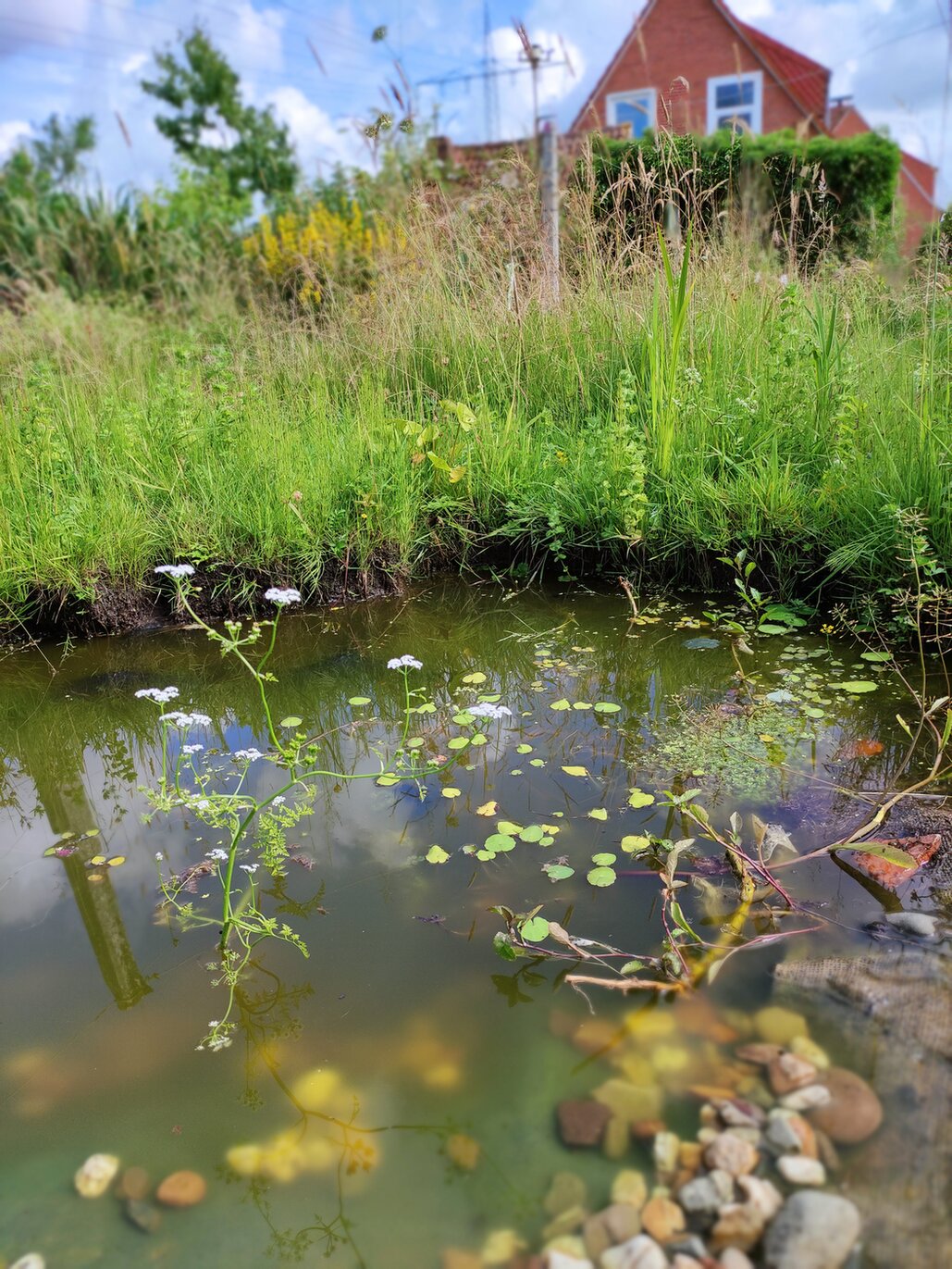 Die tiefere trocknet so langsam aus, aber es ist noch genug Wasser in ihr. Molchlarven und Käferlarven scheinen das Waser verlassen zu haben. Der Wasserstand ist um gut 20 Zentimeter gefallen. Nächste Woche soll es Regen geben.