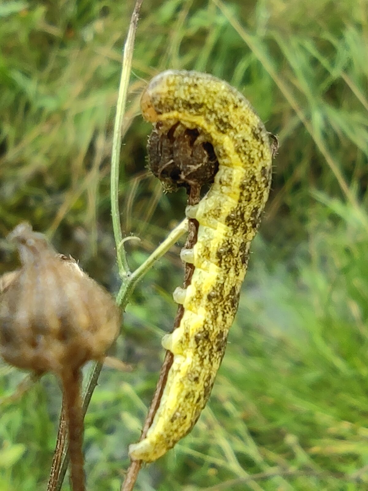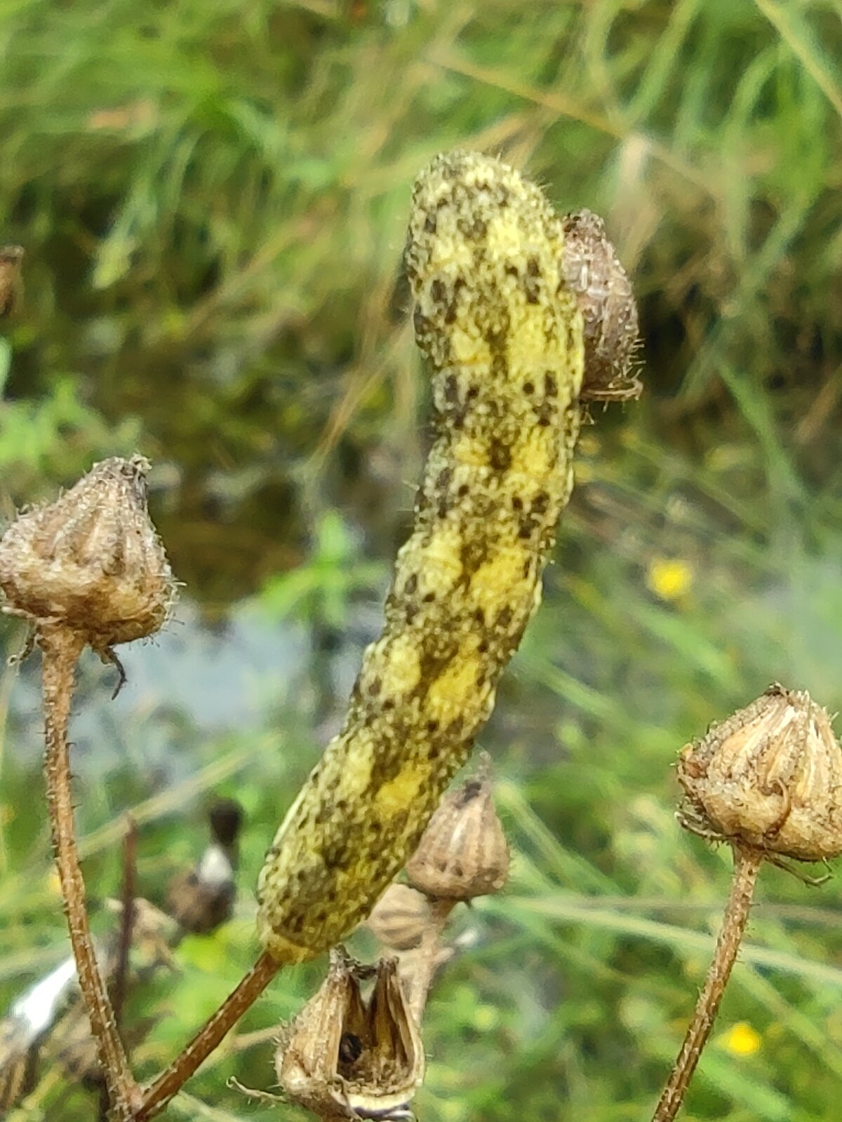 Raupe der Hasenlattich-Eule (Hecatera bicolorata) knusperte auf einem Habichtskraut.