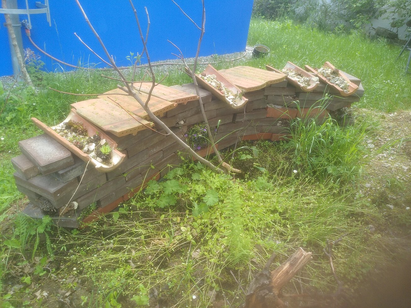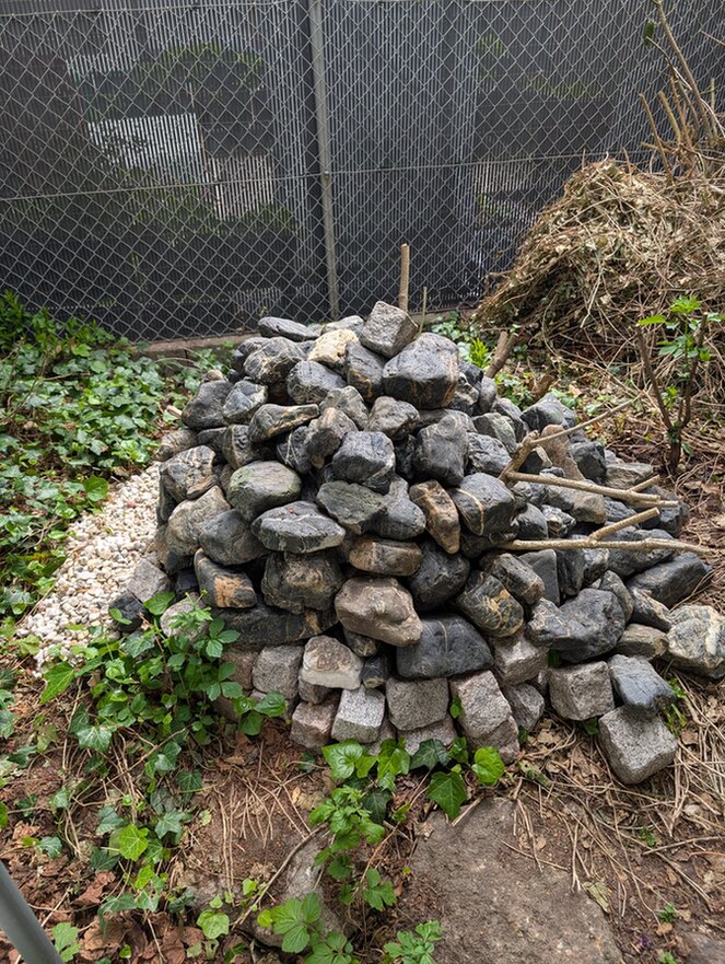 Eine Pyramide / einen Lesesteinhaufen hat der Garten jetzt auch. Die gehortelten schwarzen Steine aus Zapfendorf haben sich als sehr glitschig erwiesen und sind auf der einen Seite der Schwerkraft gefolgt. Ich denke, ich werde sie so liegen lassen.